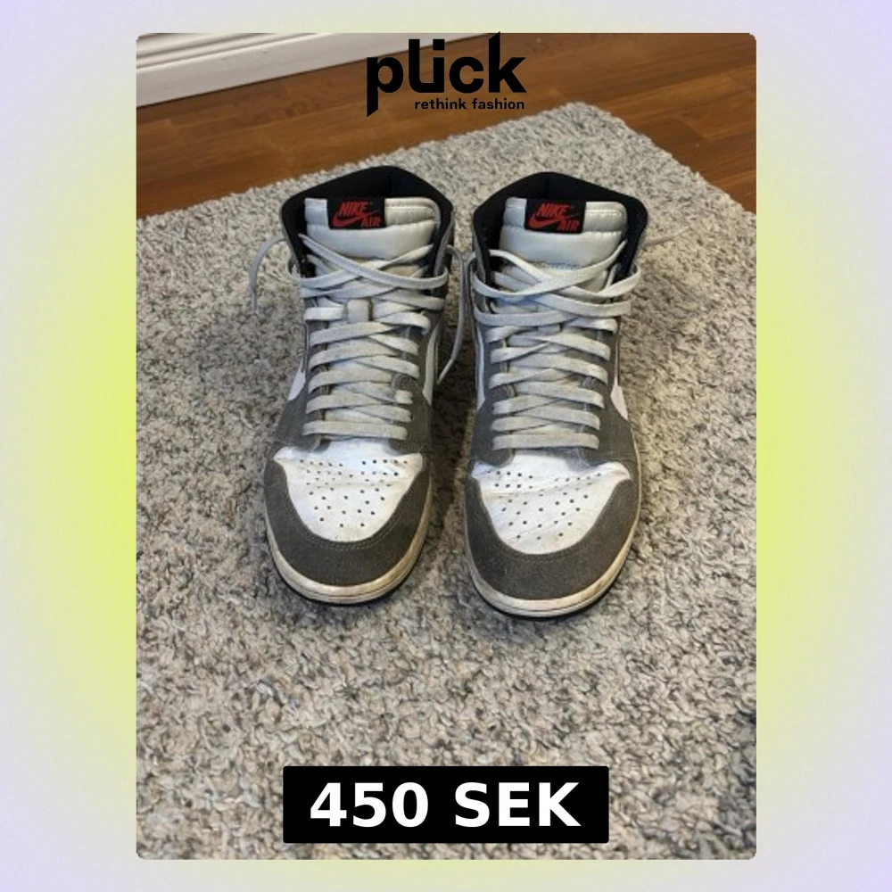 Nike Air Jordan 1 sneakers i grått och vitt med klassisk röd Nike Air-logga på plösen. Skorna har högt skaft, snörning och rund tå. Materialmix av mocka och skinn ger en snygg kontrast. Swoosh-loggan på sidan och Wings-emblemet vid ankeln. Perfekt för dig som gillar streetwear.