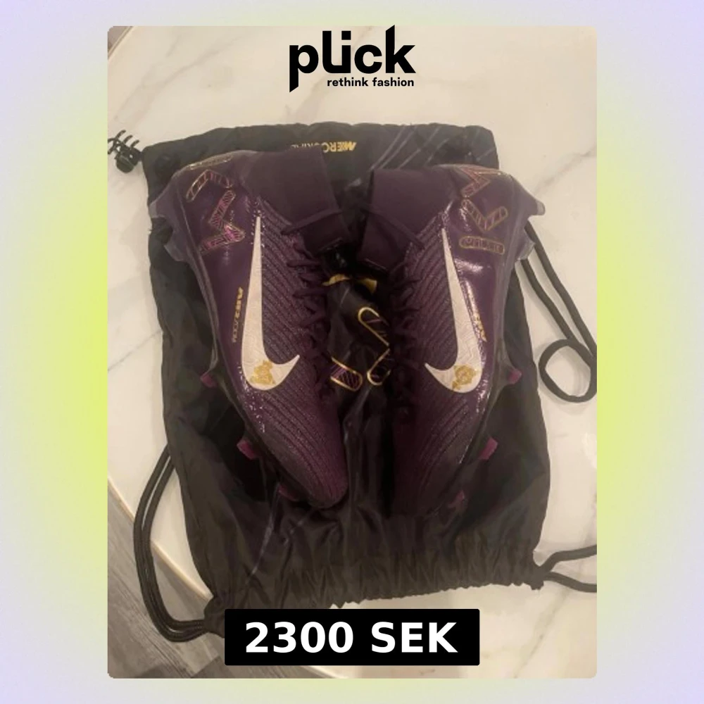Säljer ett par Nike Mercurial fotbollsskor i mörklila med guldiga detaljer och vit swoosh. Skorna har snörning, högt skaft och mönstrade grafiska inslag på sidan. Ovandelen är i syntetmaterial och designen är riktigt sportig och modern. Använts på en träning