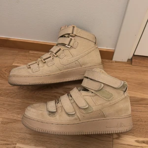 Snygga beige sneakers från Nike med flera kardborreband för en unik look. Skorna har en hög modell med vadderad krage och perforerad tå för extra komfort. Perfekta för en stilren vardagslook.