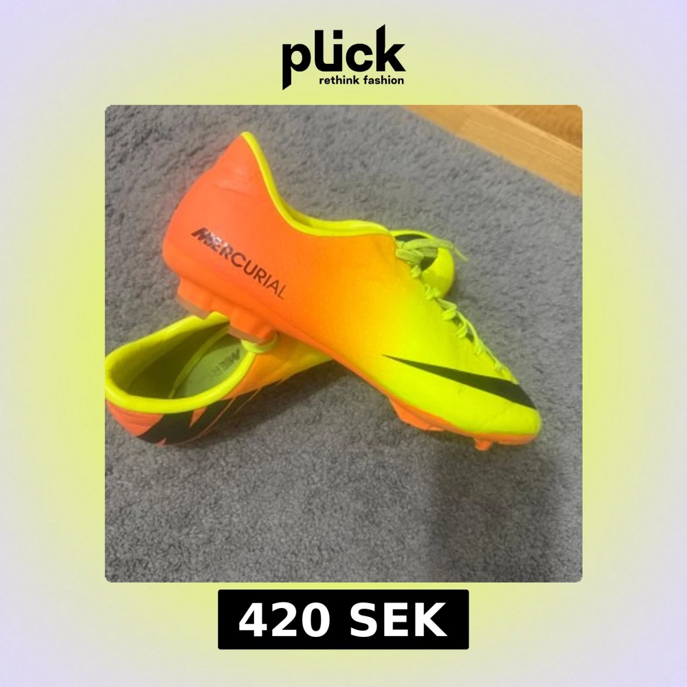 Säljer ett par Nike Mercurial fotbollsskor i en riktigt fet färgkombination av neon-gult och orange med svarta detaljer. Skorna har snörning och är gjorda i syntetmaterial för bästa känsla på planen. Perfekta för dig som vill sticka ut på matchen!