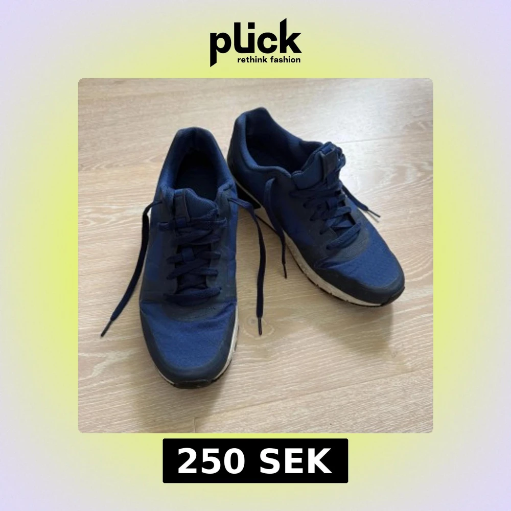 Säljer ett par mörkblå Nike sneakers med vit och svart sula. Skorna har snörning och är tillverkade i syntetmaterial med mesh-paneler för extra ventilation. Snygg sportig design med rund tå och platt sula, perfekt för dig som gillar streetstyle. Lite slitet vid tyget i hälen.