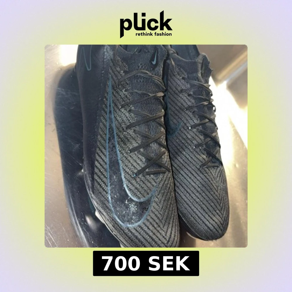 Säljer ett par svarta Nike fotbollsskor med snyggt randigt mönster och stickad ovandel. Skorna har snörning och en platt sula med dobbar för bra grepp på planen. Stora Nike-loggor i svart och grått på sidorna ger en sportig vibe.