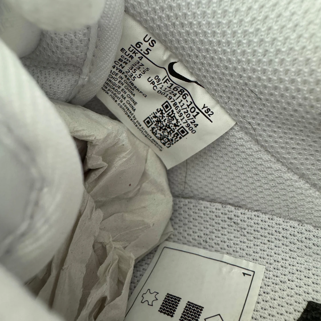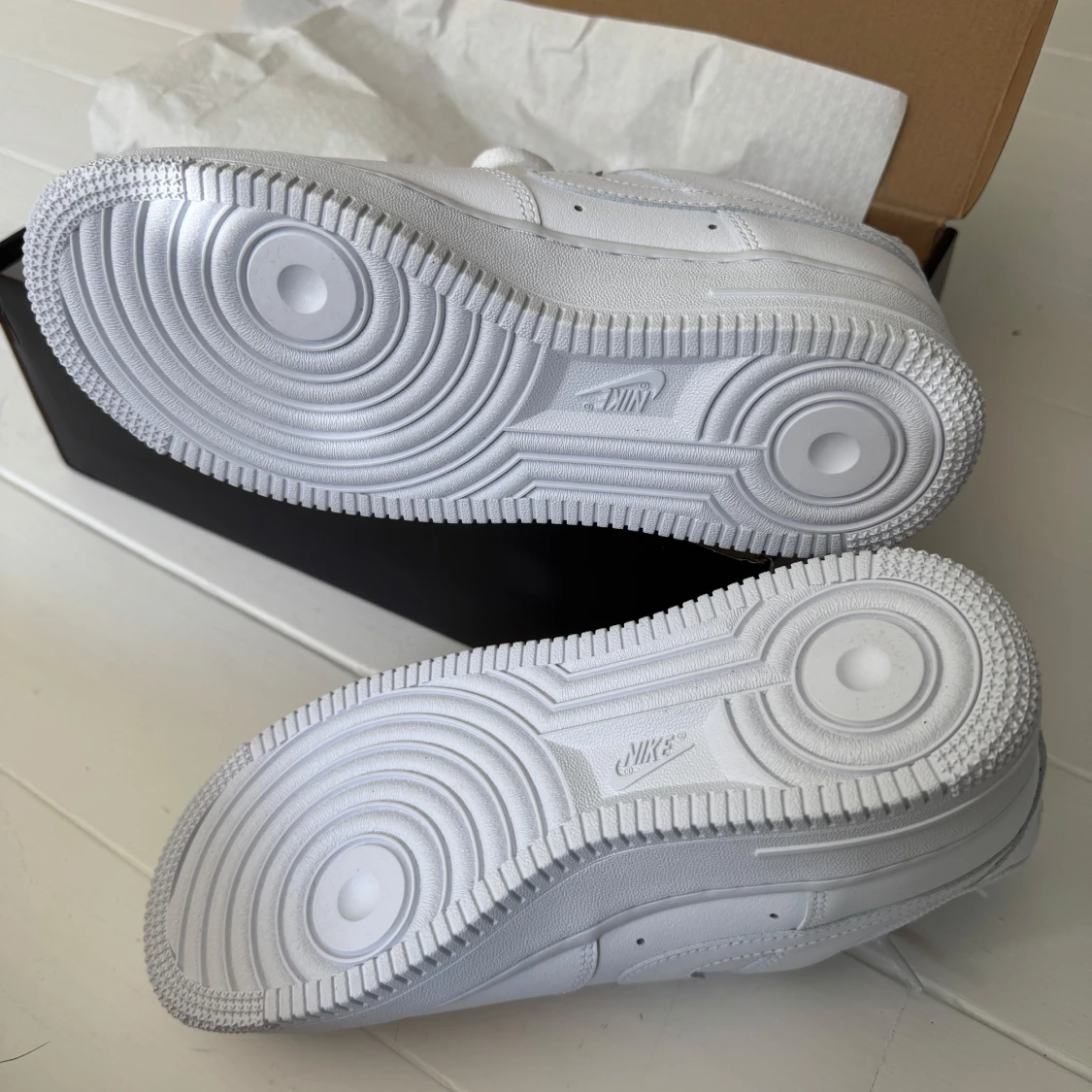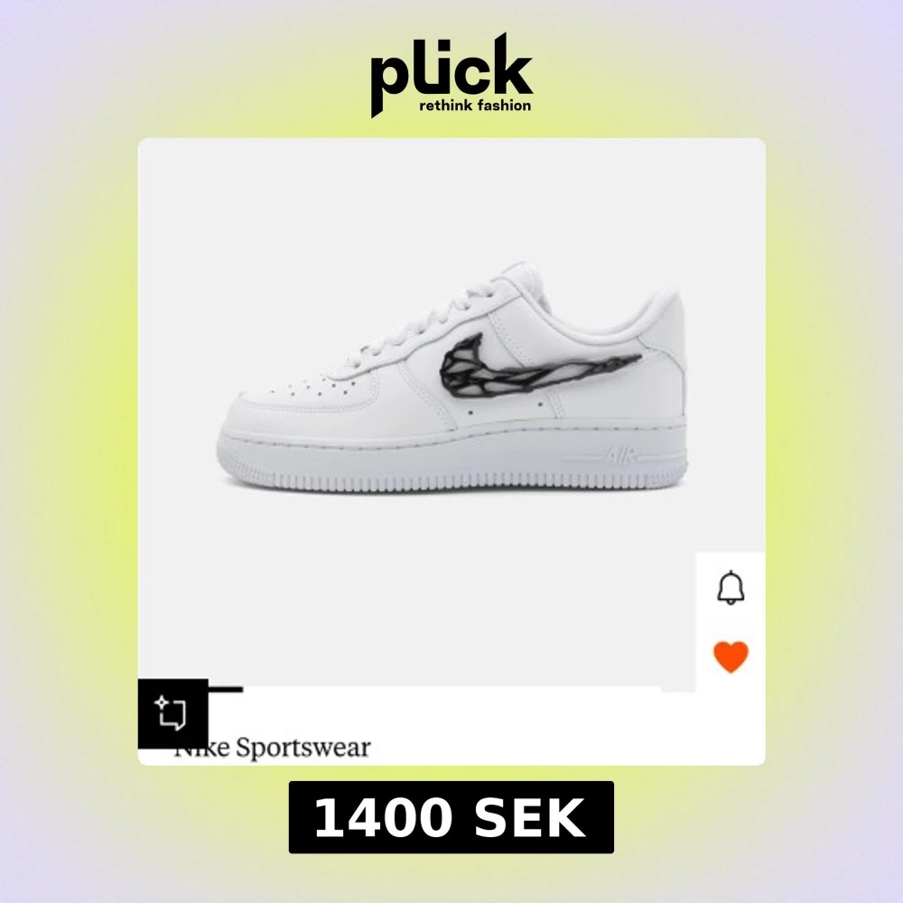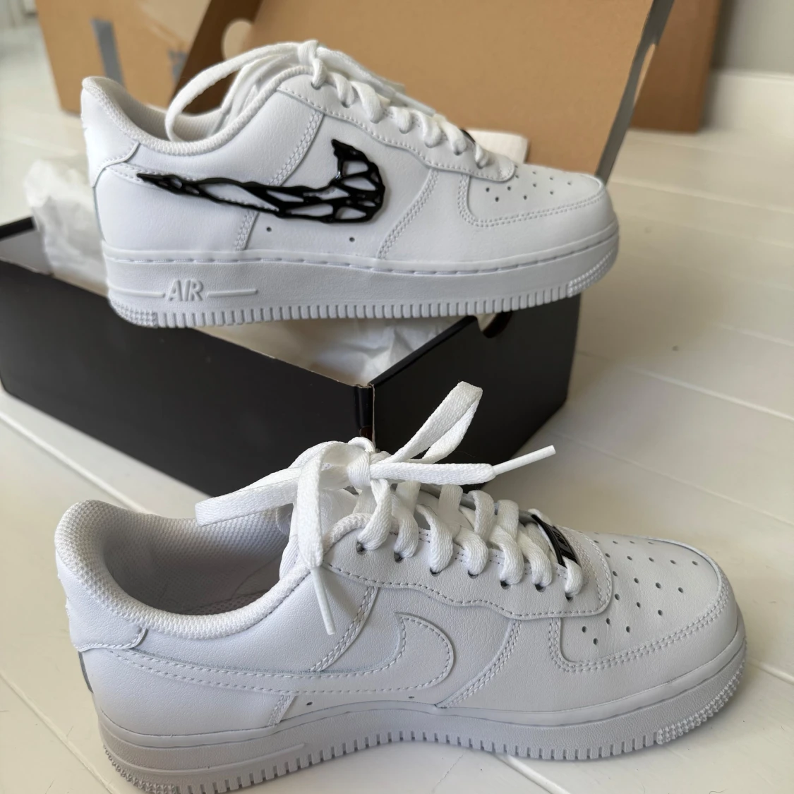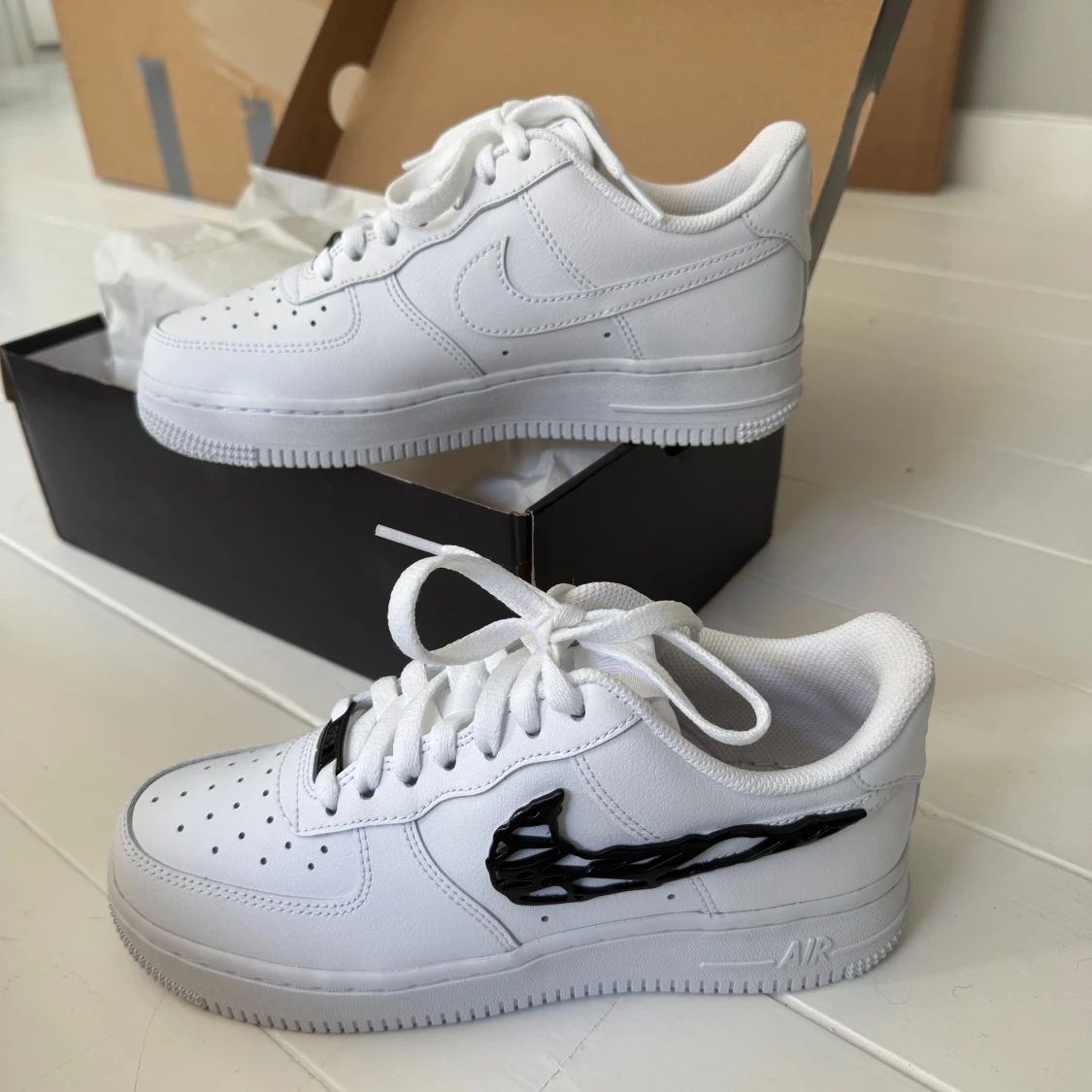 Nike Air Force 1 sneakers i helvitt skinn med unik svart 3D-custom Swoosh på utsidan. Klassisk låg modell med perforerad tå, vit platt sula och snörning. Köpt på Zalando i juni 2025, har provat dom hemma vid 2 tillfällen men inser nu att dom inte passar min stil. Original kartong medföljer.