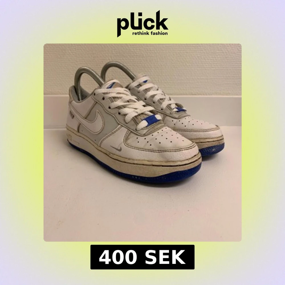 Säljer ett par klassiska Nike Air Force 1 sneakers i vitt skinn med grå detaljer och blå sula. Skorna har snörning och rund tå, samt tydlig Nike-logga på sidan och hälen. Perfekta för dig som gillar Stockholm och streetwear stil. (Små skador) på skon, märks knappt.