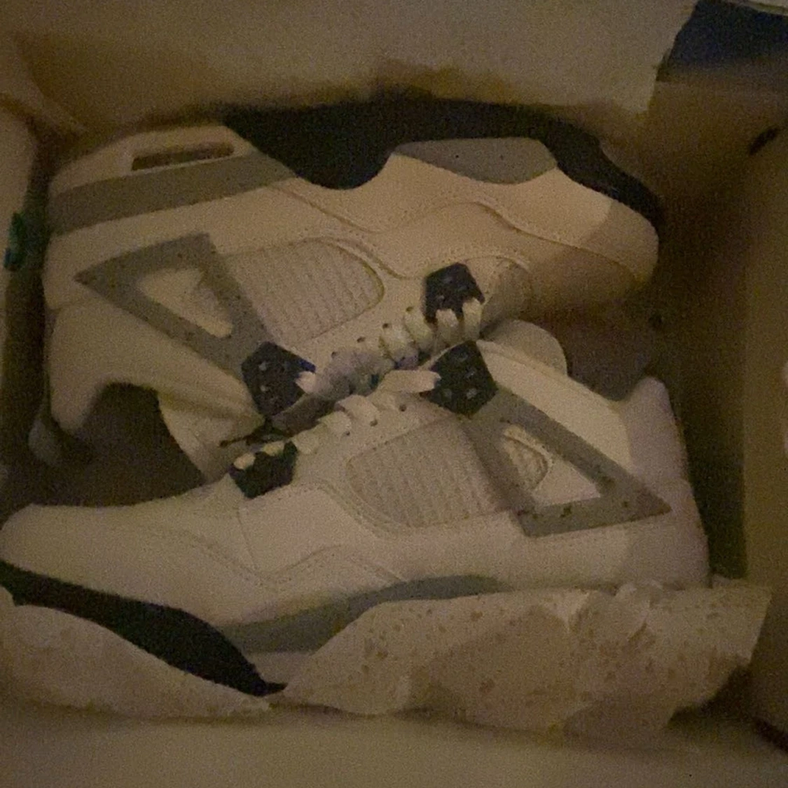 Säljer ett par Nike Air Jordan 4 sneakers i vitt med mörkblå och gråa detaljer. Klassisk siluett med meshpaneler på sidorna, snörning och platt sula. Perfekta för dig som gillar streetstyle och vill sticka ut med en ikonisk modell.