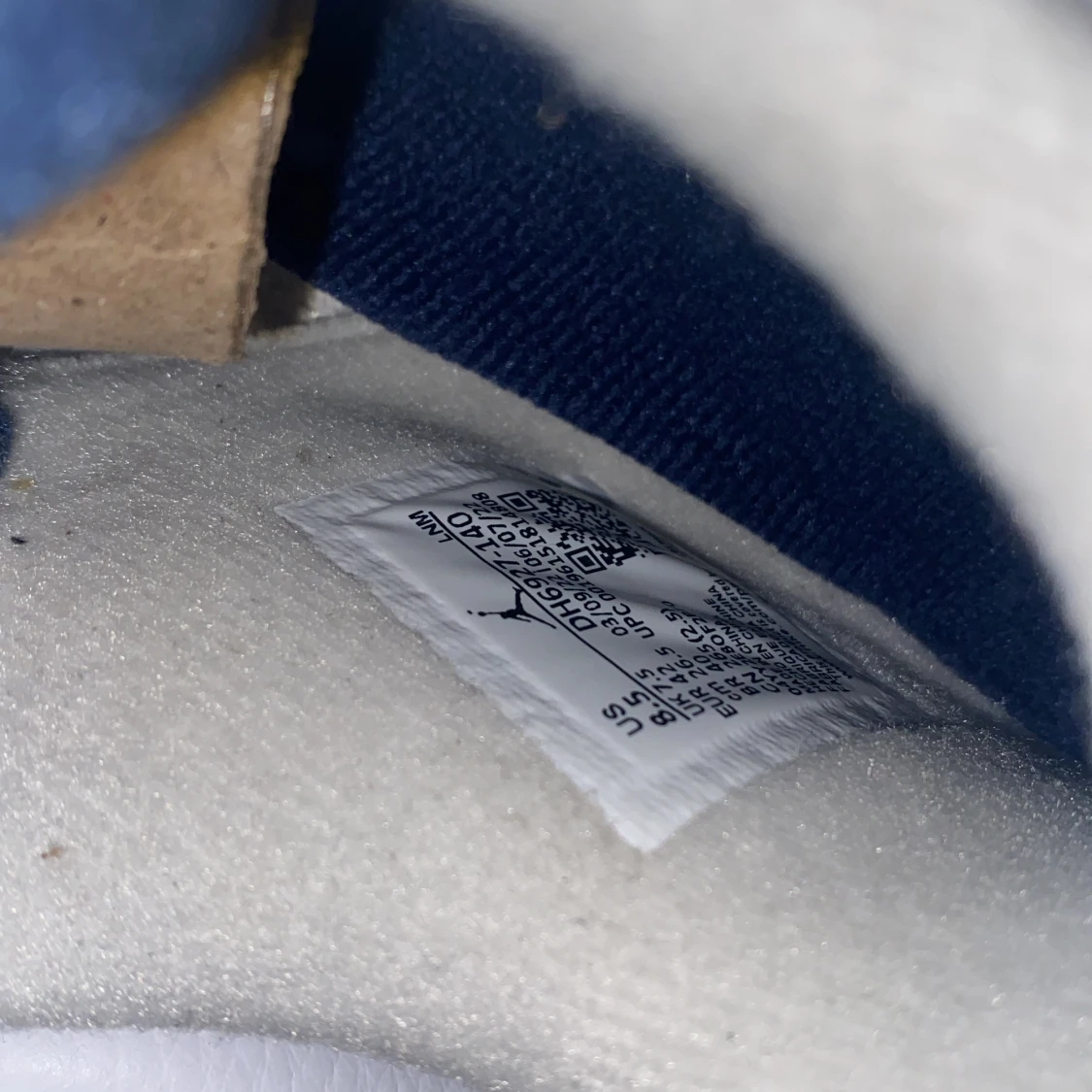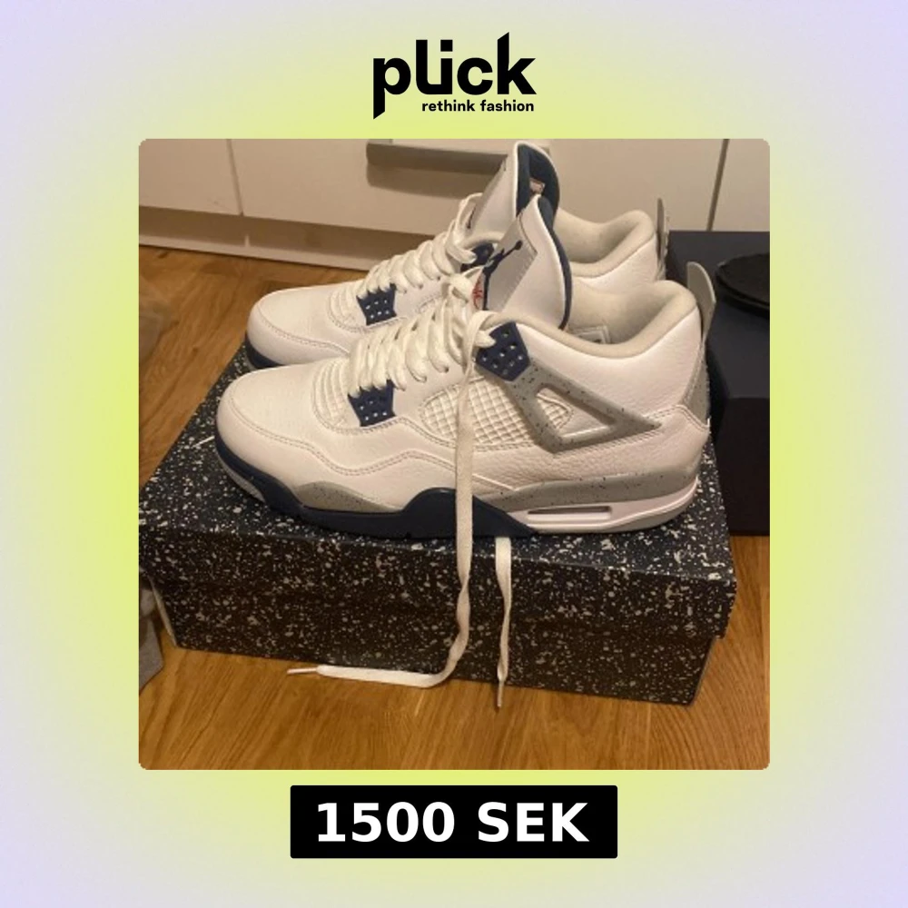 Nike Air Jordan 4 navy blue med vit ovandel i skinn, grå och marinblå detaljer samt röd Jumpman-logga på plösen och sulan. Klassisk siluett med snörning och meshpaneler på sidorna. Snygg kontrast mellan de olika färgerna och speckled midsole.