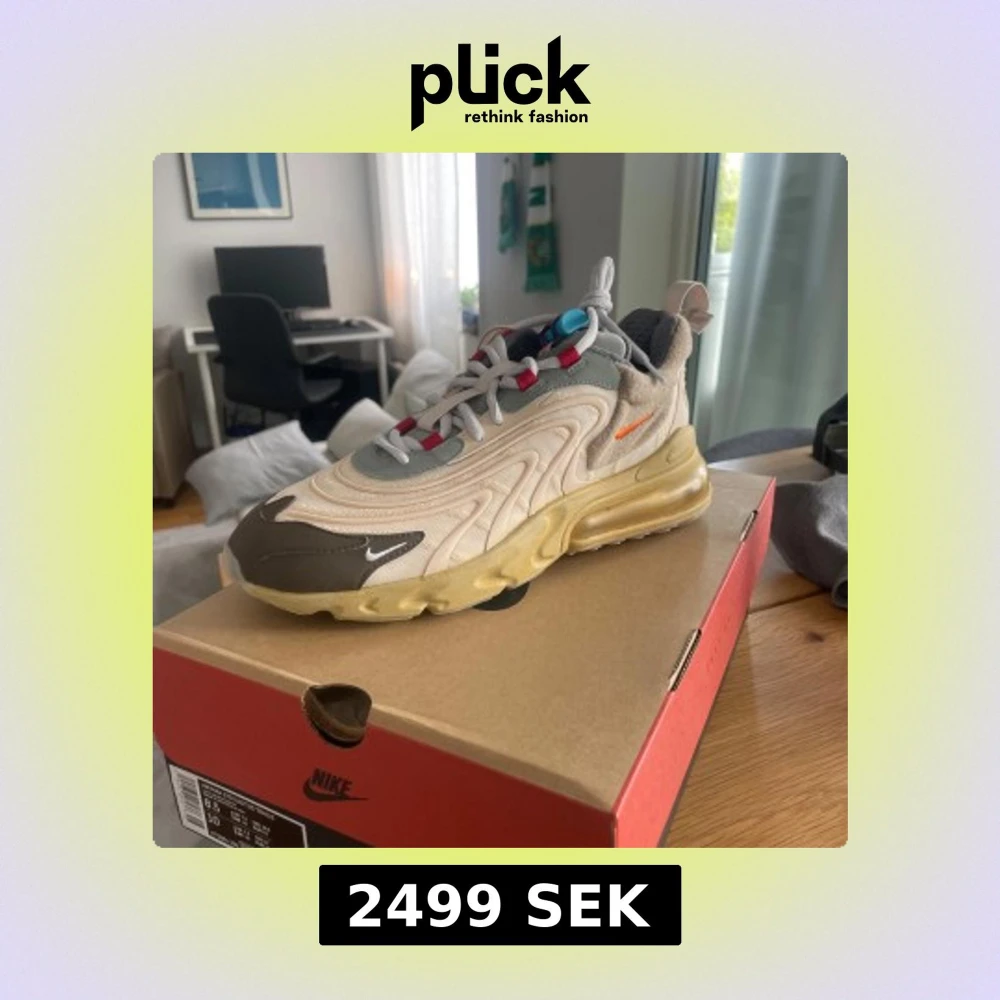 Nike Air Max 270 React i beige, grå och bruna toner med röda detaljer. Snygg vågig design, synlig Air Max-sula och små orange swoosh-loggor. Ovandel i syntet och textil, plös med blå detalj och snörning. Perfekta sneakers för dig som gillar streetstyle.