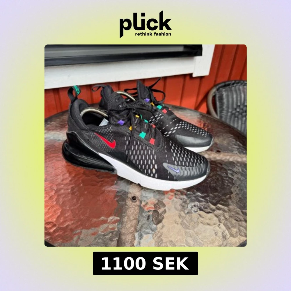 Nike Air Max 270 sneakers i svart mesh med vita och grå detaljer, färgglada öglor i rött, grönt, gult och lila. Skorna har stor synlig Air-enhet i hälen och vit sula. Perfekta för dig som gillar en sportig och färgstark look. Använda 2/3ggr och har några skavanker (se bilderna).