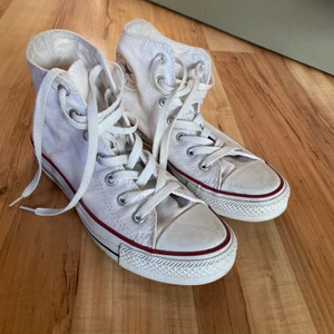 Säljer mina älskade helt vanliga vita converse som tyvärr är för små! Storlek 37.5. Köpte de second hand och har inte kommit till användning för mig mer än 1 eller 2 gånger. Finns en ytterst liten gräsfläck på insidan av skon (bild 2) men inget märkbart.