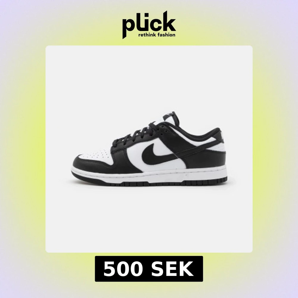 Snygga Nike Dunk Low sneakers i klassisk svart och vit färgkombination. Skorna har en låg profil med snörning och den ikoniska Nike-loggan på sidan. Perfekta för en stilren look.