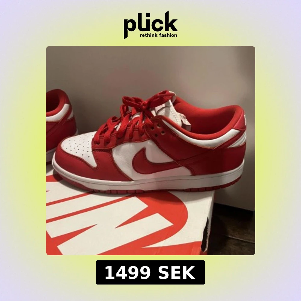 Snygga Nike Dunk Low i färgen University red. De är i riktigt bra skick, storlek Eu 45. Kartongen finns kvar. Tveka inte att höra av er vid minsta lilla fundering!