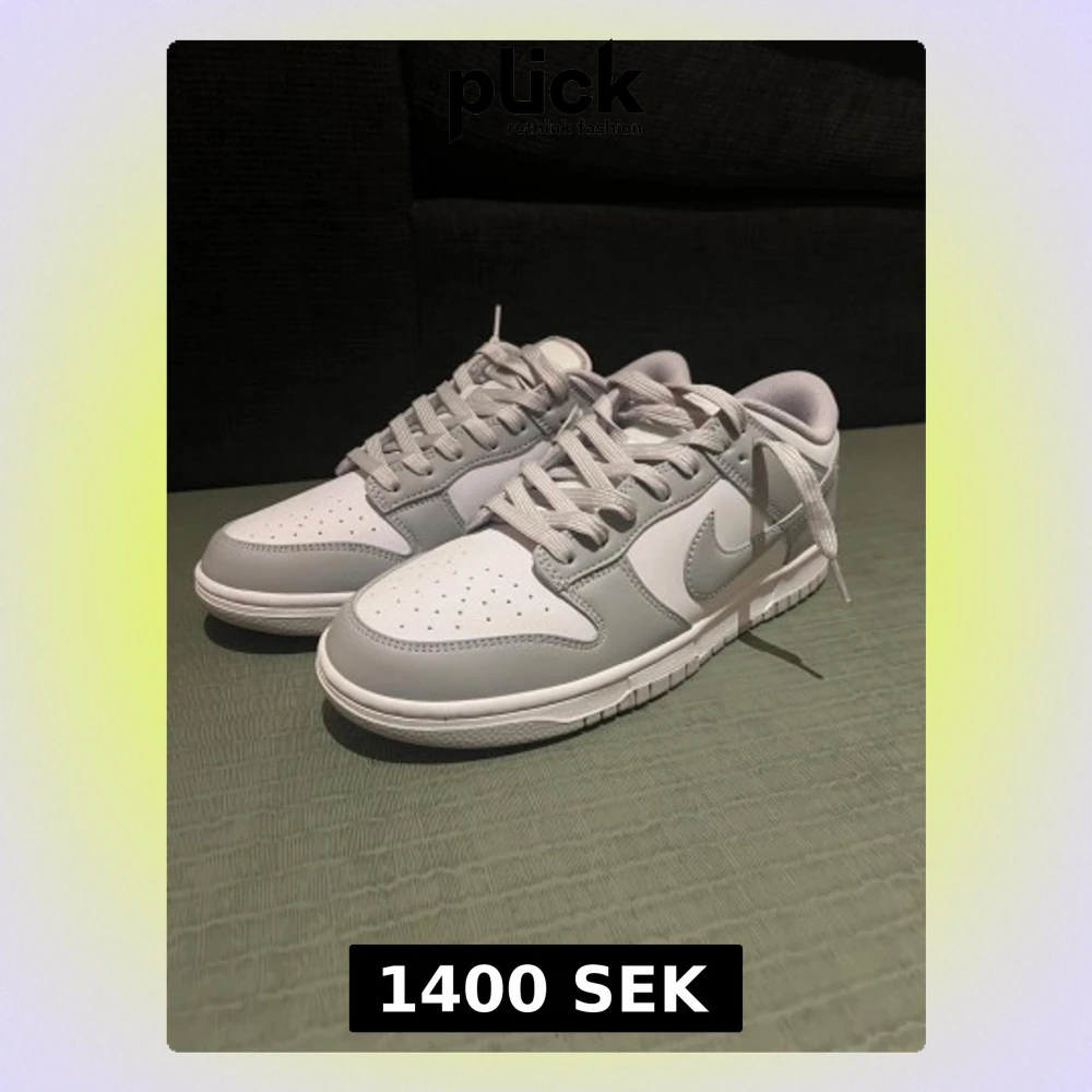 Helt nya Nike Dunk Low sneakers i vit och ljusgrå färg.