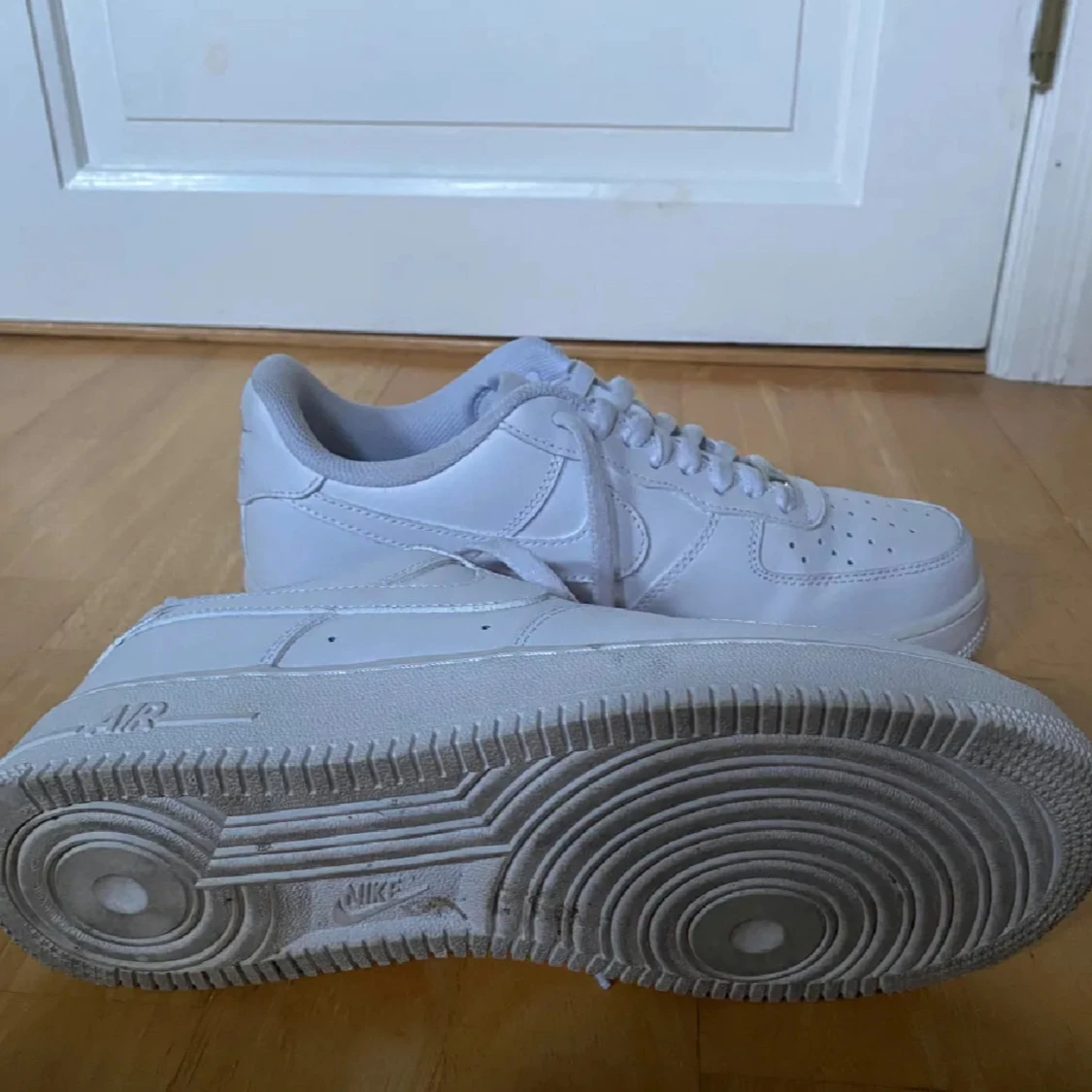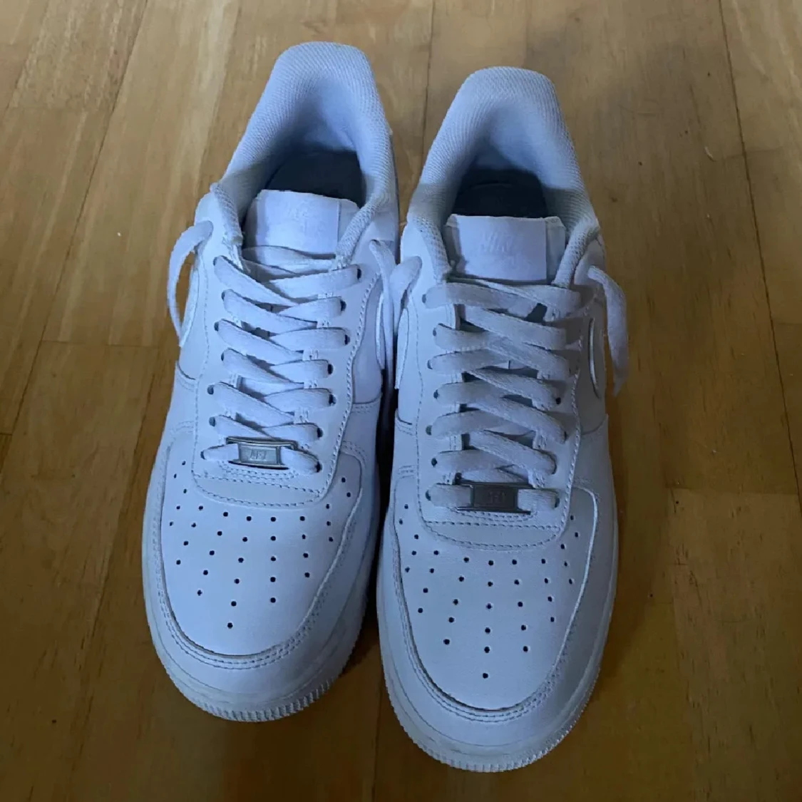 Nike Air Force 1 sneakers i helvitt med klassisk låg siluett. Skorna har snörning, perforerad tå och platt sula med tydlig Air-dämpning. Tillverkade i skinn med syntetdetaljer och har rund tå. Perfekt för dig som gillar cleana och tidlösa sneakers.