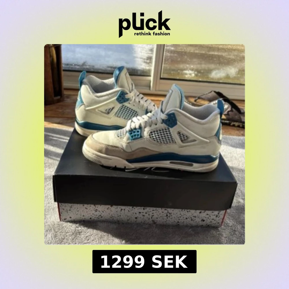 Nike Air Jordan 4 Retro i färgen Off White/Military Blue. Klassiska sneakers med meshpaneler, blå detaljer och snörning. Skorna har en platt sula och rund tå, tillverkade i skinn och syntet. Ikonisk Jumpman-logga på plösen och boxen medföljer.