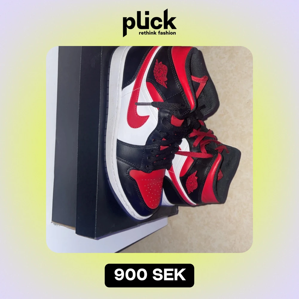 Pris kan diskuteras!!!Säljer ett par Nike Air Jordan 1 Mid i klassiska färgerna svart, röd och vit. Skorna har en snygg design med snörning och den ikoniska Air Jordan-loggan på sidan. Perfekta för både vardag och fest. De är i mycket bra skick och kommer i originalkartong. Inte använda.