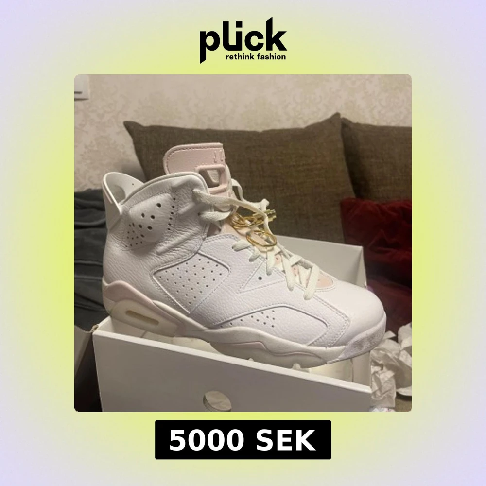 Säljer ett par stilrena Nike Air Jordans i vitt med rosa detaljer. Skorna har snörning och är tillverkade i syntetmaterial. Perfekta för den som vill ha en klassisk och sportig look.