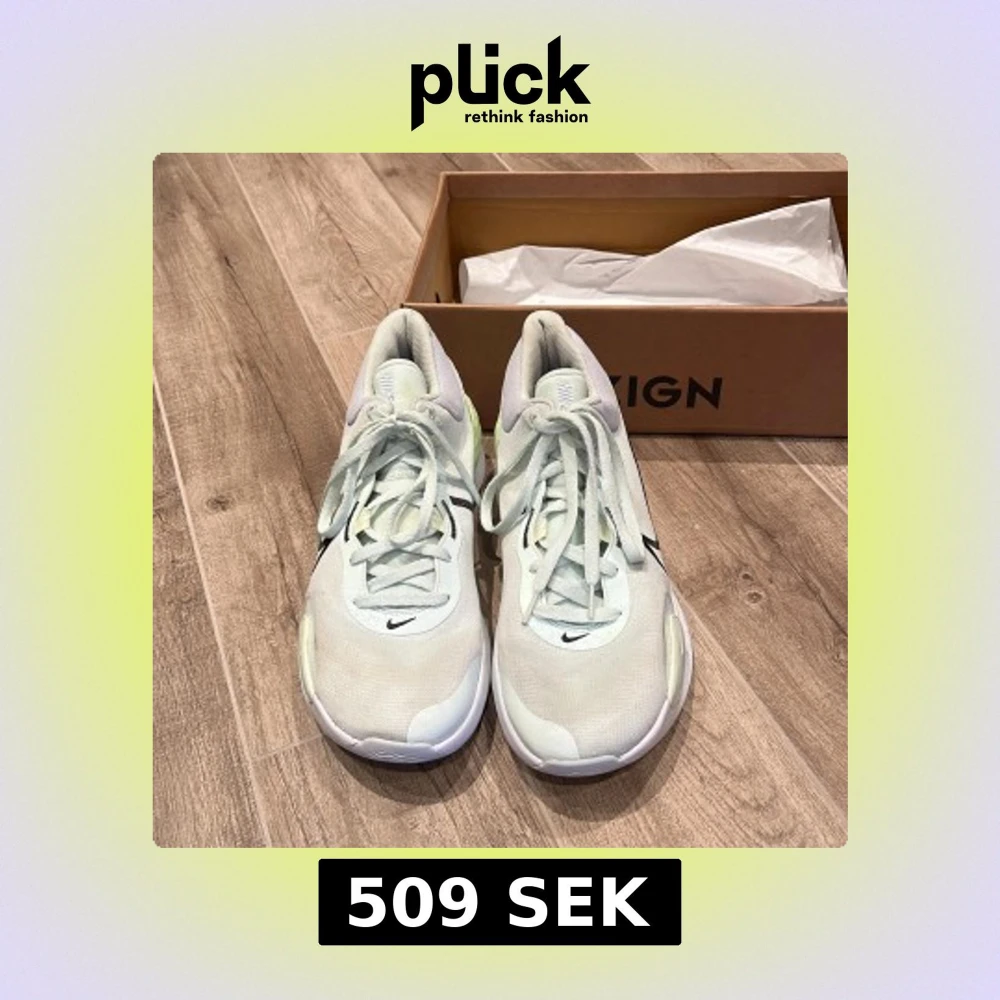 Säljer ett par vita Nike sneakers med snörning och svarta detaljer. Skorna har en sportig design med en mjuk och bekväm passform. Perfekta för träning eller vardagsbruk. Priset kan diskuteras