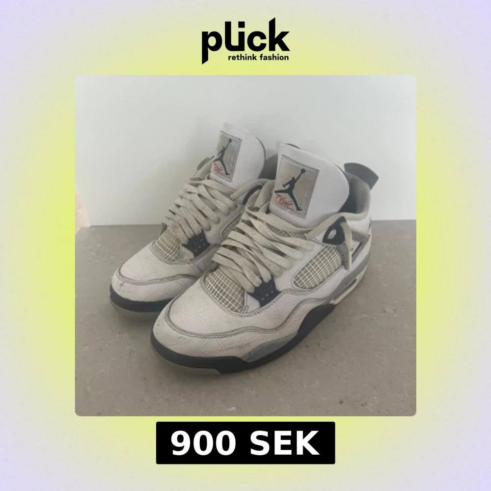 Säljer ett par klassiska Nike Air Jordan 4 sneakers. Skorna är vita med blå detaljer, meshpaneler och ikonisk Jumpman-logga på plösen. Perfekta för dig som gillar streetwear och vill sticka ut med en tidlös modell.