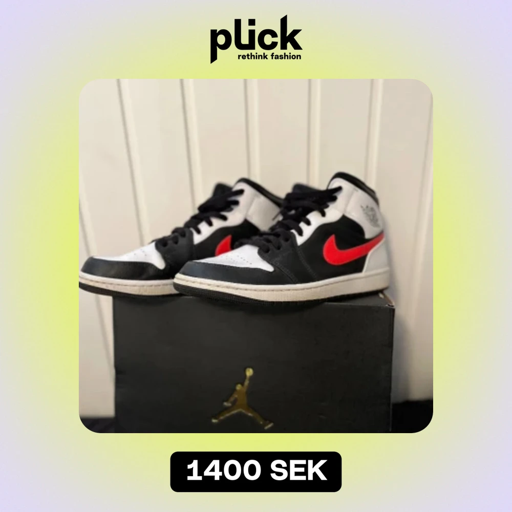 Ett par Jordans 1 mid i färg Black/Chile red Storlek 44,5 Har använts 3-4ggr Original låda finns Pris kan diskuteras :)