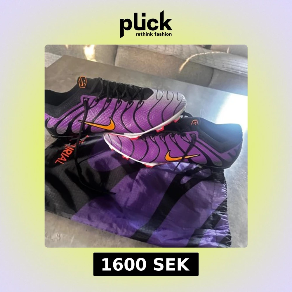 Nike Mercurial fotbollsskor i lila och svart med orange swoosh och svarta snören. Skorna har syntetmaterial, snörning och mönstrad ovandel. Yttersulan har vita, blå och röda detaljer samt Zm Air-dämpning för extra komfort på planen.