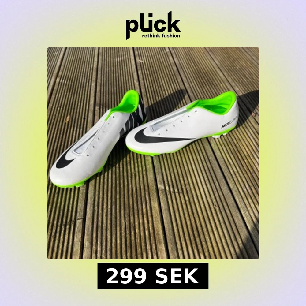 Snygga Nike Mercurial fotbollsskor i vitt med svarta och neongröna detaljer. Skorna har en strömlinjeformad design med snörning och en tydlig Nike-logga på framsidan. Perfekta för fotbollsplanen! Utan skosnöre!
