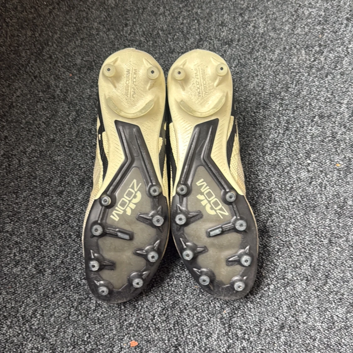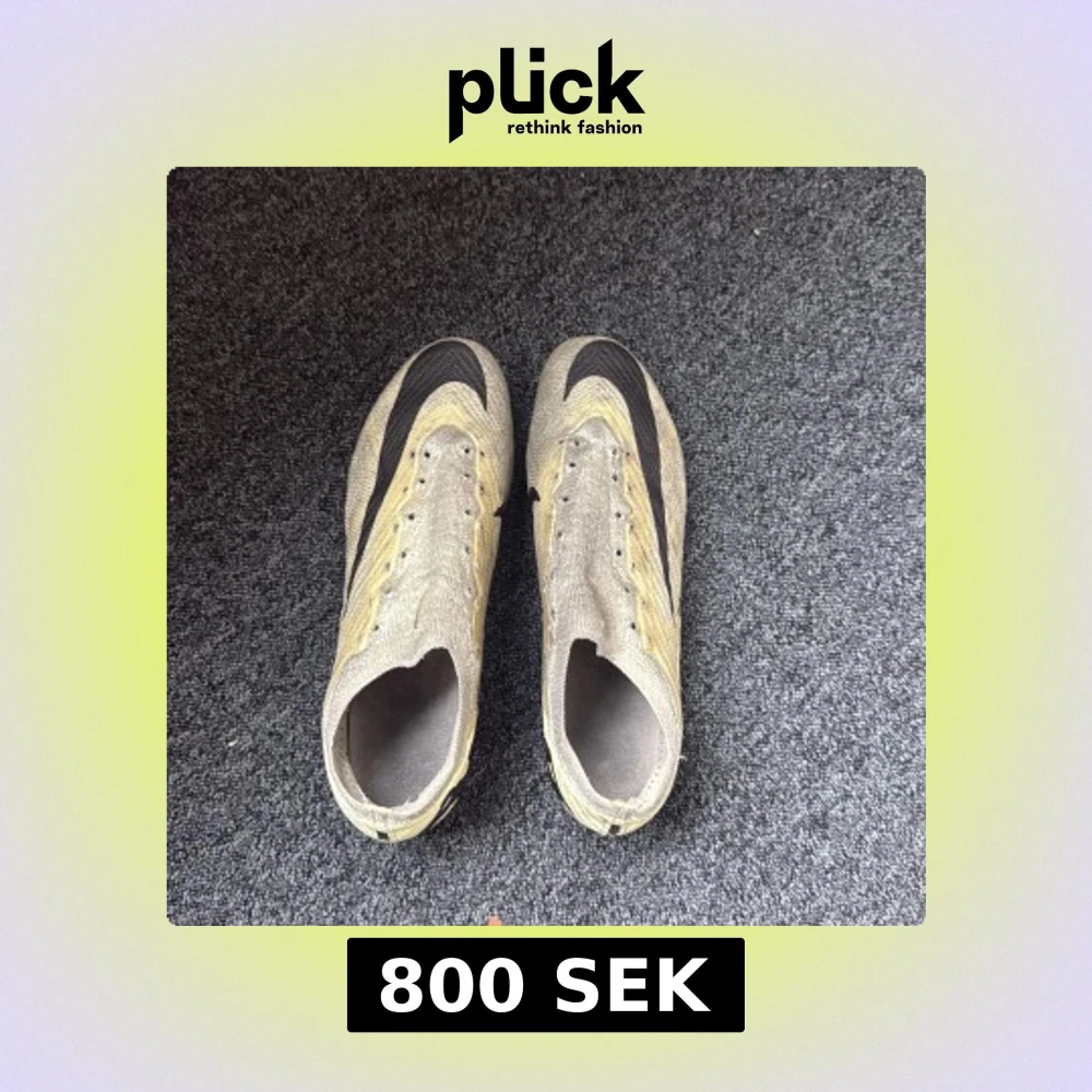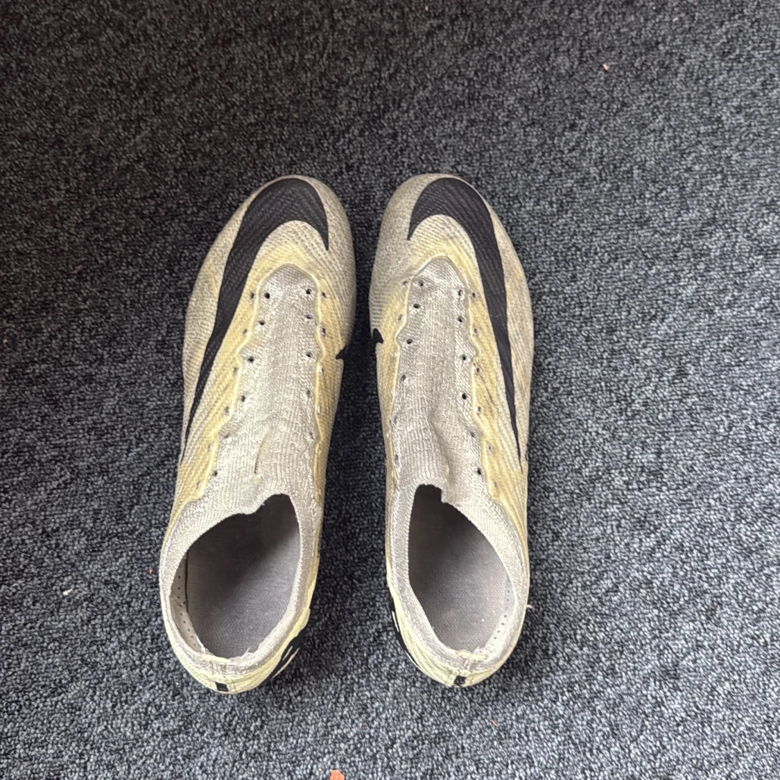 Säljer ett par Nike Mercurial fotbollsskor i grått med svarta detaljer och snörning. Skorna har plös och mönstrad ovandel i syntetmaterial samt fasta dobbar för spel på gräs. Andvänt i en säsong