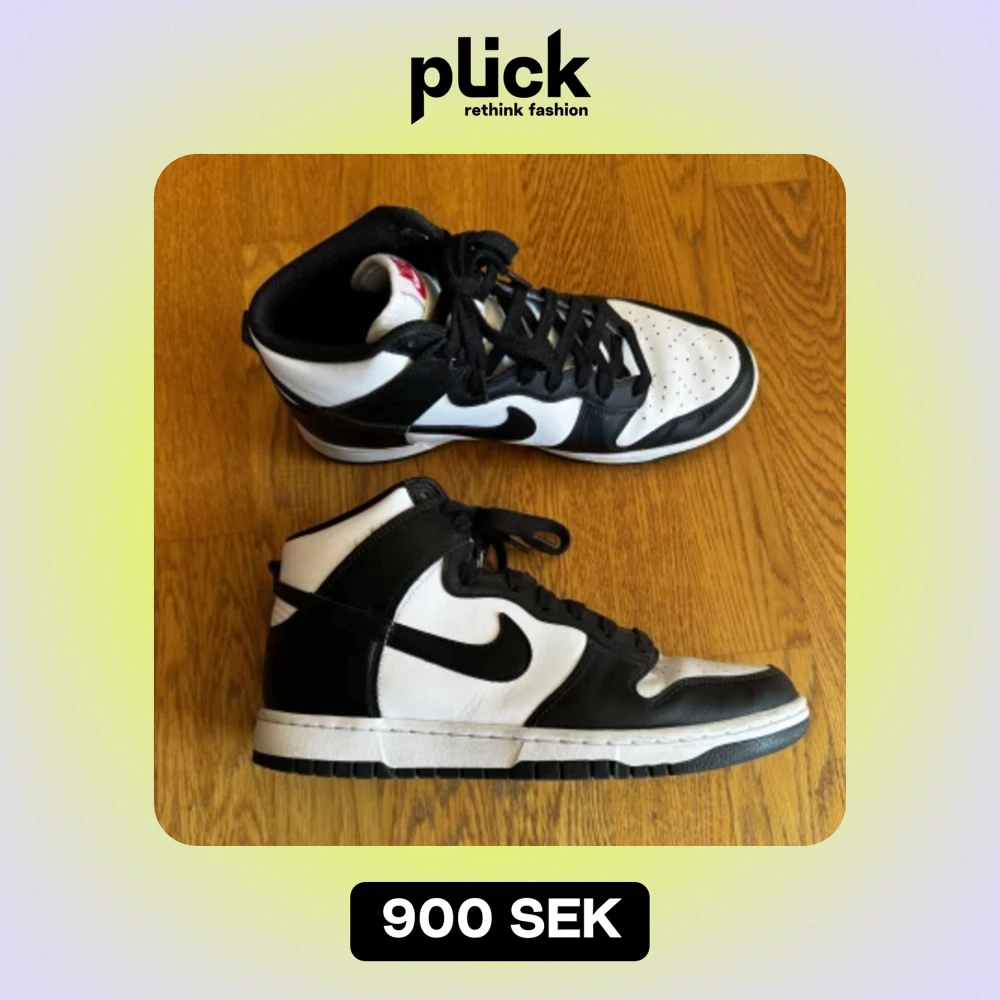 Ett par panda dunks i nyskick köpta på sneakershyllan i Stockholm för 2499 kr kvitto finns digitalt, storlek 44