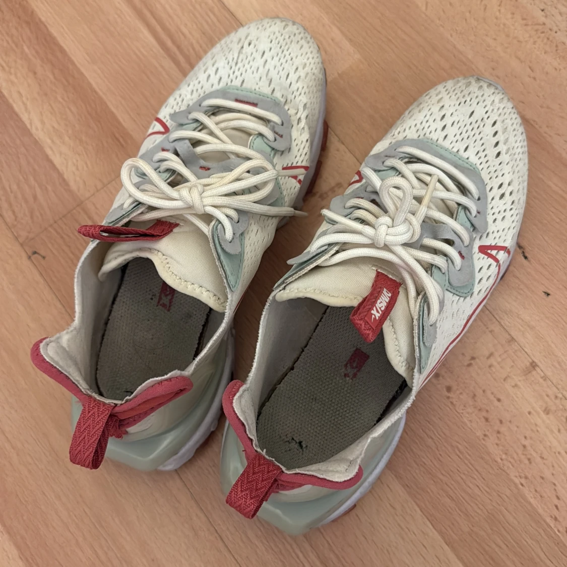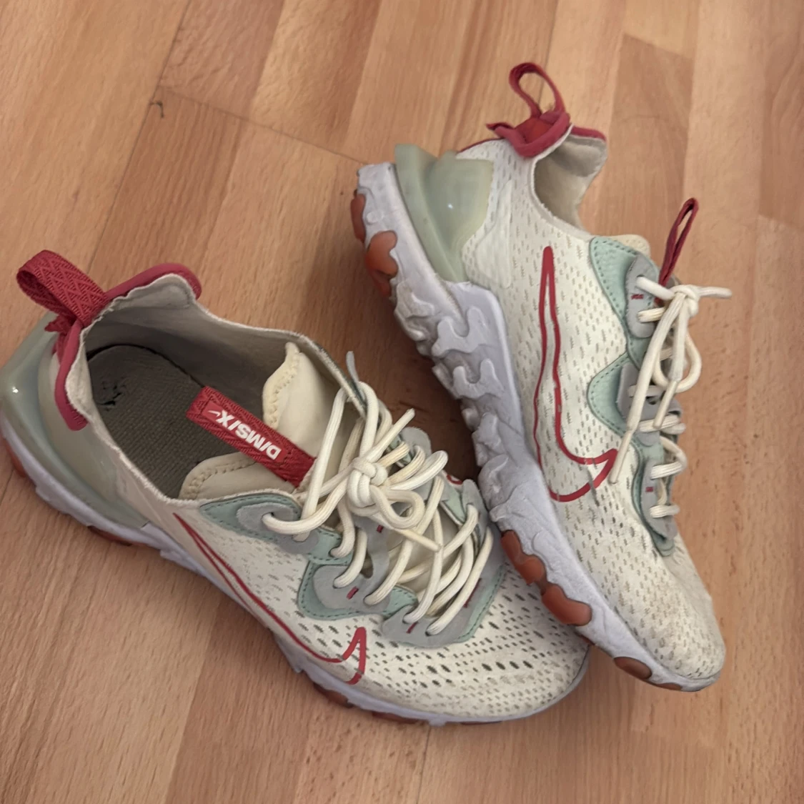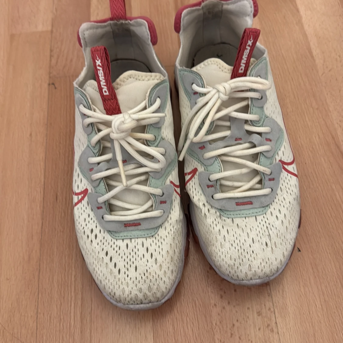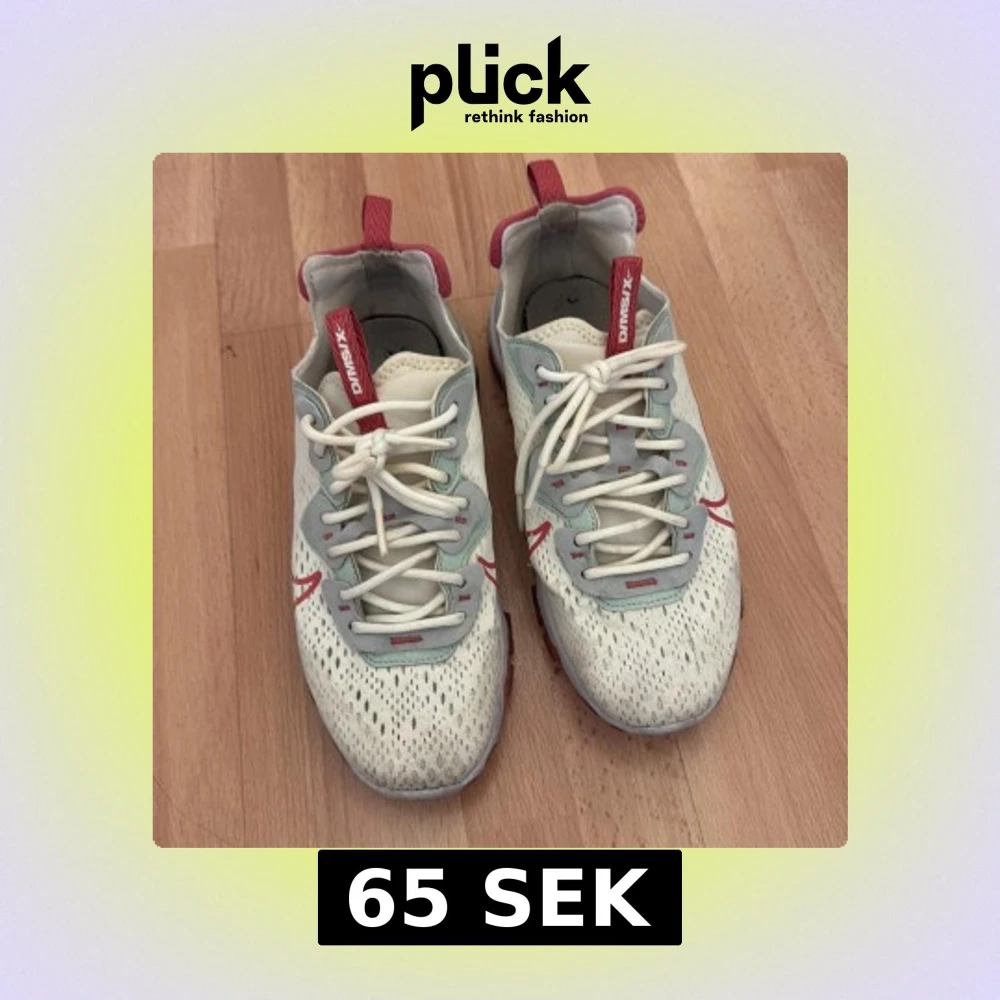 Nike React Element 87 D/MS/X sneakers i vitt mesh med ljusgrå och mintgröna detaljer, röda accenter och snörning. Snygg design med genomskinliga partier och röda swoosh-loggor på sidorna. Skön och futuristisk sula med orange detaljer. Perfekta för dig som gillar streetwear.