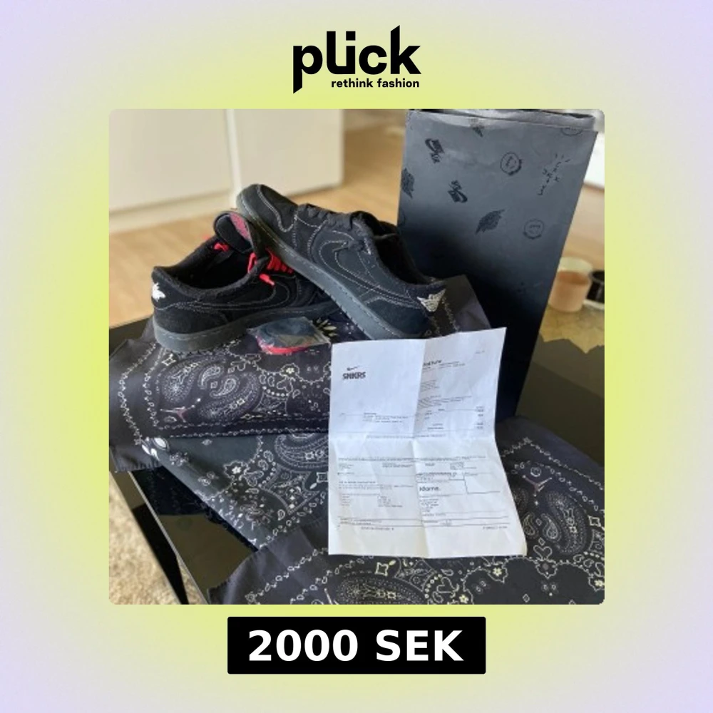 Nike SB Dunk Low i samarbete med Travis Scott. Skorna är svarta med vita kontrastsömmar, paisley-detaljer och levereras med både svarta och röda skosnören. Klassisk Nike-logga på tungan och Travis Scott-logga på hälen.