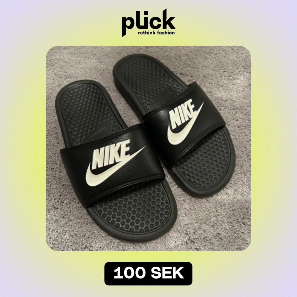 Nike tofflor - Calm slide - Säljer dessa näst intill oanvända nike tofflor. Säljer pga att min bror köpte precis likandana som vi kan dela på. De är i nyskick och väldigt sköna. Strl 44, jag bär 42,5 i alla mina skor så de är väldigt små i storleken.