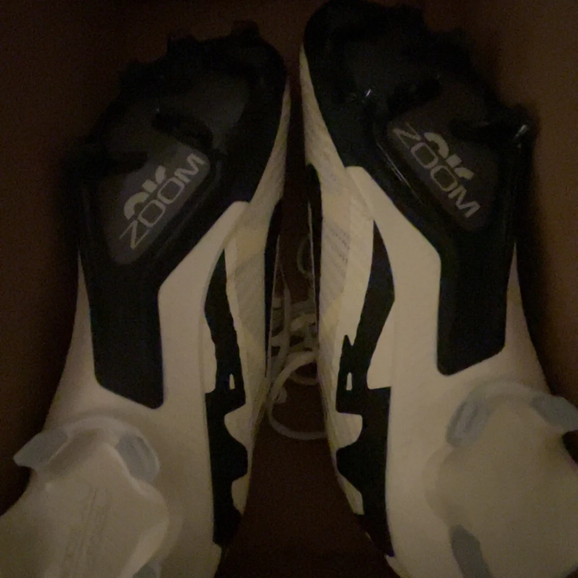 Säljer ett par Nike Zoom Mercurial i vitt med svarta detaljer. Skorna har en strömlinjeformad design med snörning och är perfekta för sportiga aktiviteter. De är tillverkade i syntetmaterial för en lätt och bekväm känsla.