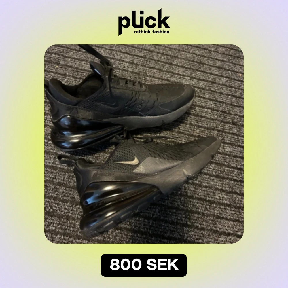 Svarta Nike Air Max 270 - Snygga svarta Nike Air Max 270 i storlek 38. Dom har knappt blivit använda och när jag väl har använt dom så har jag varit försiktig. Säljer skorna då jag har växt ur dom. Det är en pytteliten skada på hälen som man ser på bilden men det är inget man tänker på och det borde inte vara något problem. Skorna är köpta på JD för ca 1500kr. Om du är intresserad så tveka inte på att höra av dig
