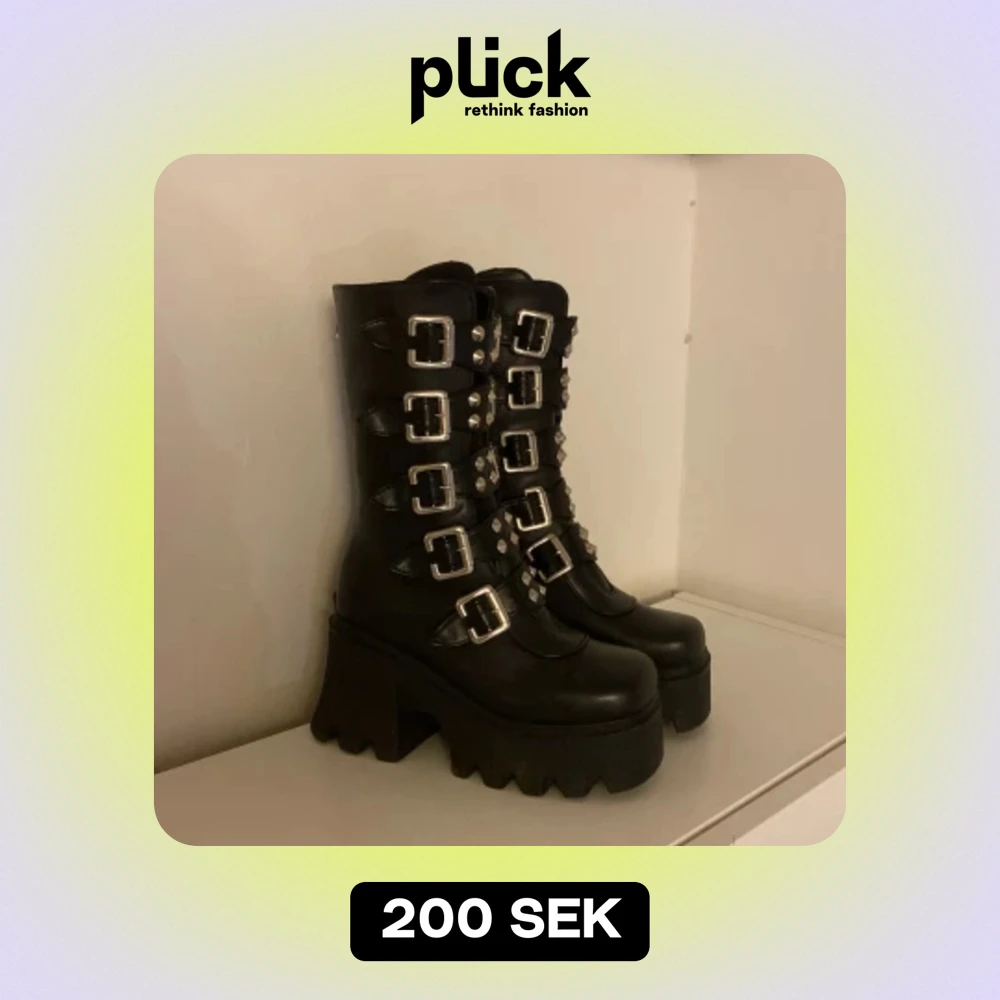 Säljer mina Demonia-liknande kängor med nitar och spännen. De har använts sparsamt men en bit av spännet har åkt av från båda skorna (3:de bilden) Köpta från Amazon för 700kr. Innermått: ca 22,5 cm. Pälsdjur finns i hemmet! 🐾