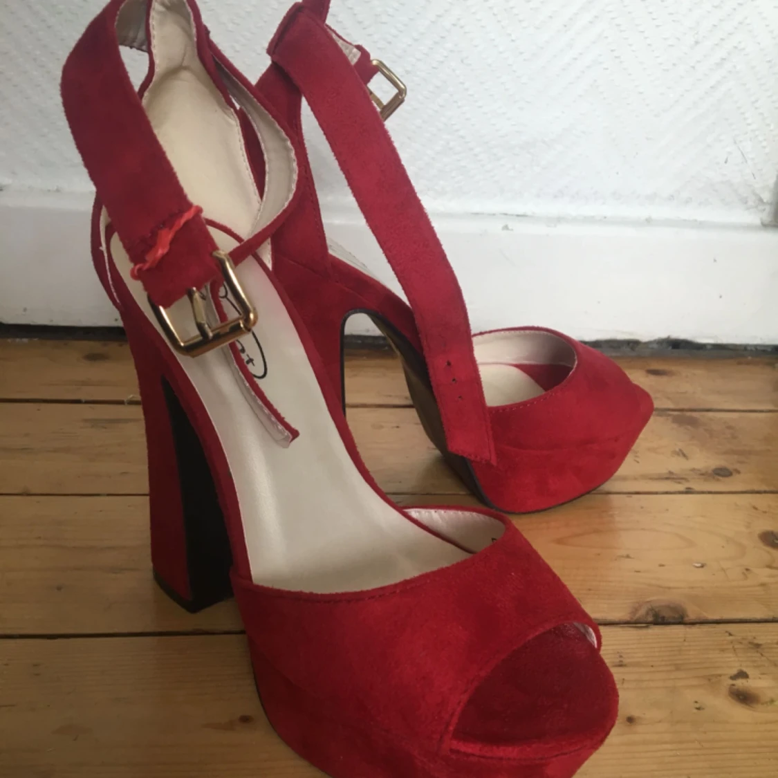 Säljer dessa supersexiga röda klackar då de är lite förstora för mig! Har endast använt dem en gång och då stod jag mest bara still i dem. De är str 38 men skulle säga mer 39. Som man kan se på första bilden så har en ”flärp” gått av vilket det gjorde första gången jag skulle knäppa dem, flärpen är kvar i lådan och skickas med såklart, jag har löst det provisorist med lite ståltråd! Kan mötas upp i Malmö, annars så står köparen för frakt! :)