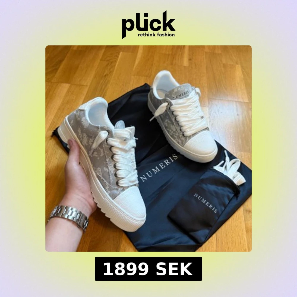 Snygga sneakers från Numeris i grått och vitt med subtilt blommigt mönster. Skorna har breda vita snören, vit platt sula med räfflad undersida och detaljer i både textil och skinn