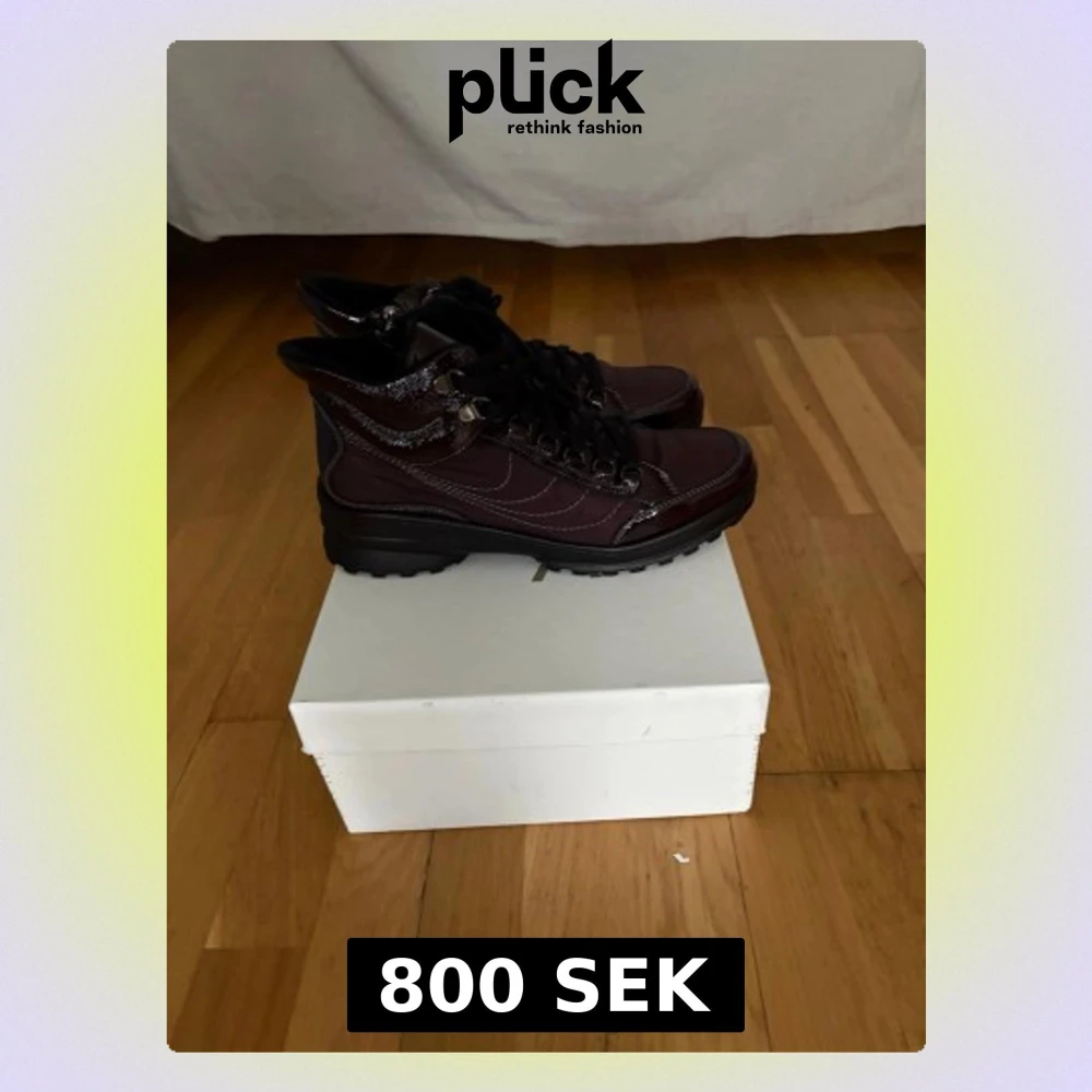 Säljer ett par mörkbruna boots med robust sula och snörning. Skorna har detaljer i både skinn och mocka, samt metallhål för snören. Perfekta för höst och vinter, med en cool outdoor-vibe och snygga kontrastsömmar.
