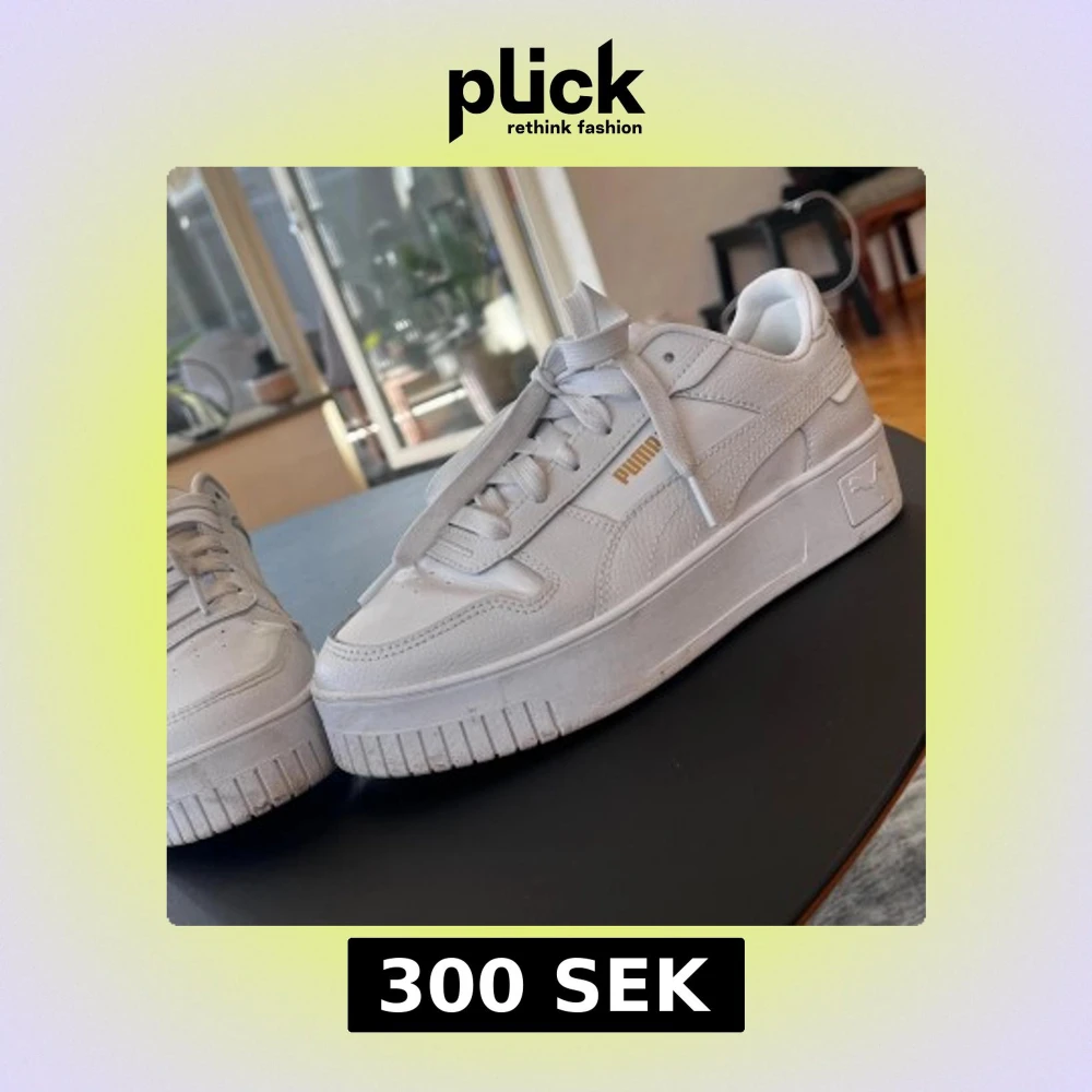 Säljer ett par fräscha vita Puma sneakers med platåsula och snygga detaljer i guld. Skorna har klassisk snörning, rund tå och är tillverkade i skinn med en stilren look. Perfekta för dig som gillar chunky sneakers och vill ha något som sticker ut.