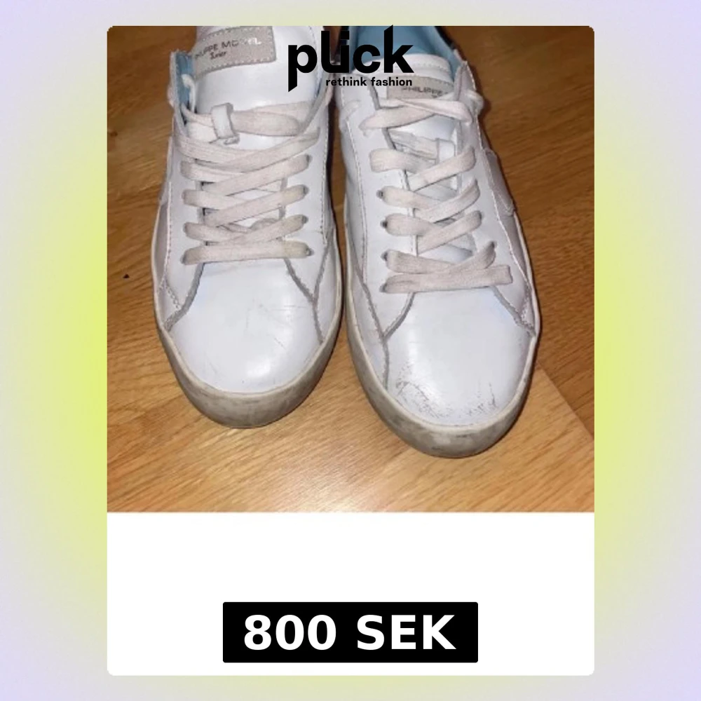 Säljer ett par klassiska vita Philippe Model sneakers med svarta detaljer på hälen och ljusblå insida. Skorna har rund tå, snörning och är tillverkade i skinn. Perfekta till jeans eller shorts för en clean och stilren look.