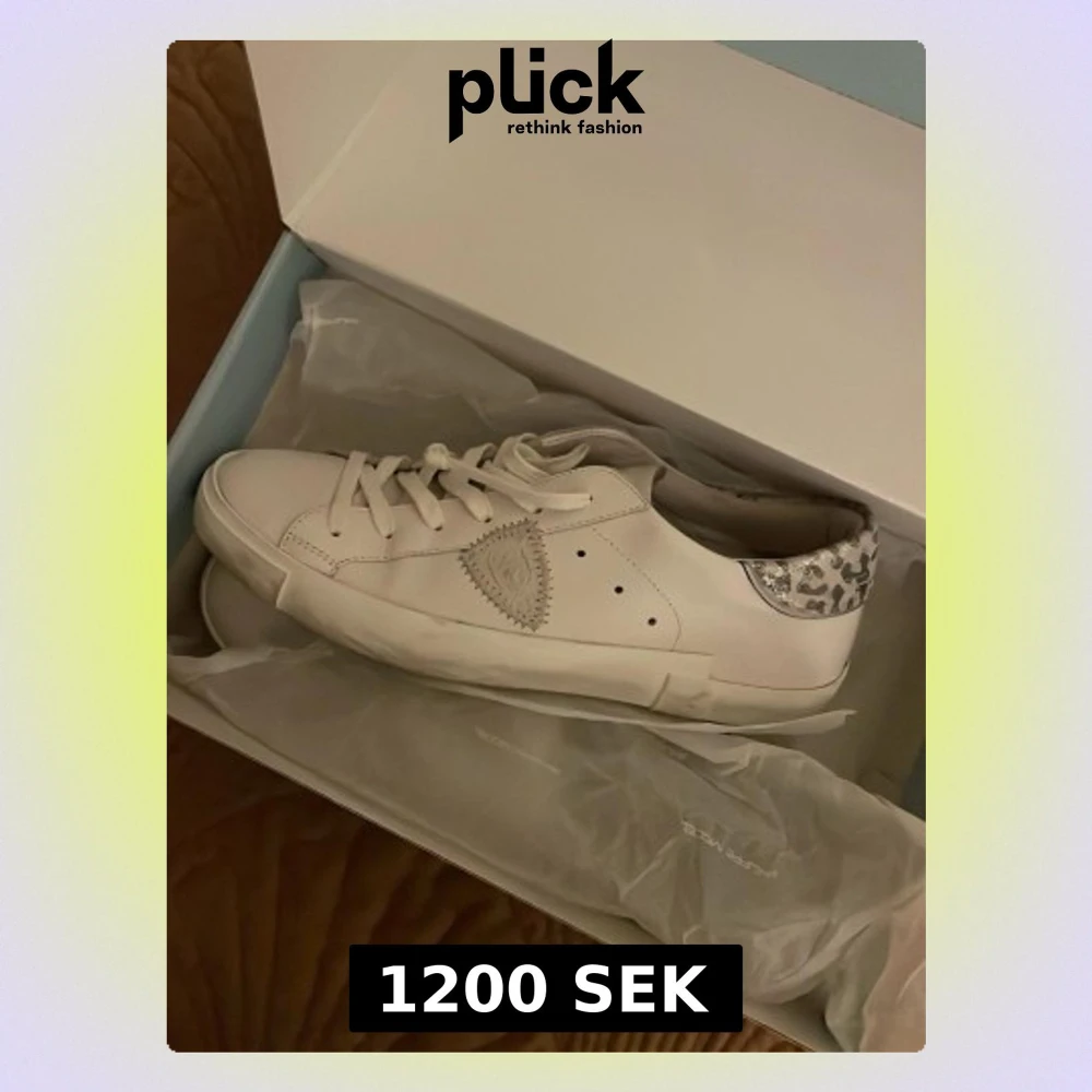 Snygga vita sneakers från Philippe Model med snörning och rund tå. Skon har en unik leopardmönstrad detalj i silver på hälen och ett broderat emblem på sidan. Tillverkad i skinn för en lyxig känsla och stilren look. Aldrig använda av mig då de är förstora, men köptes på Vinted och hon innan hade endast använt de 1-3 ggr.
