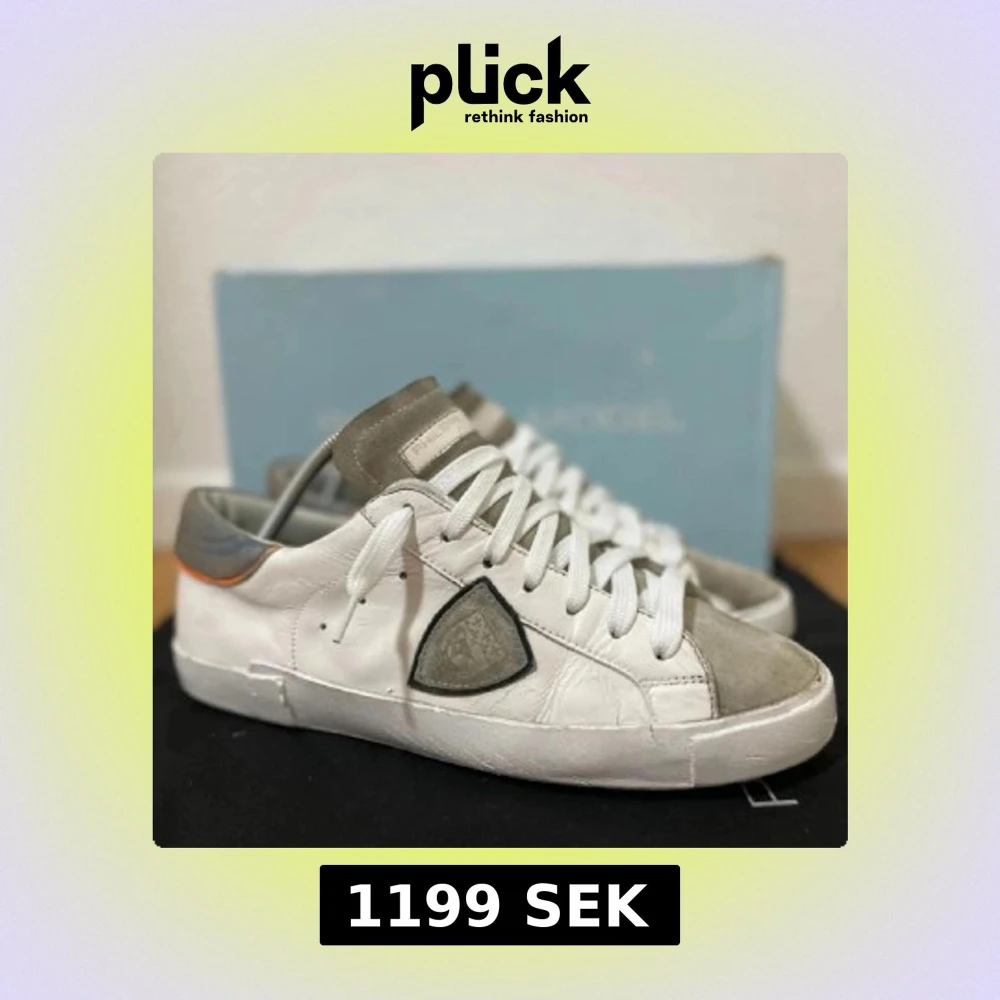 Snygga vita sneakers från Philippe Model med grå mockadetaljer på tå och plös. Skorna har en ikonisk sköldlogga på sidan, vita skosnören och diskret orange detalj vid hälen. Tillverkade i skinn och mocka för en lyxig känsla.