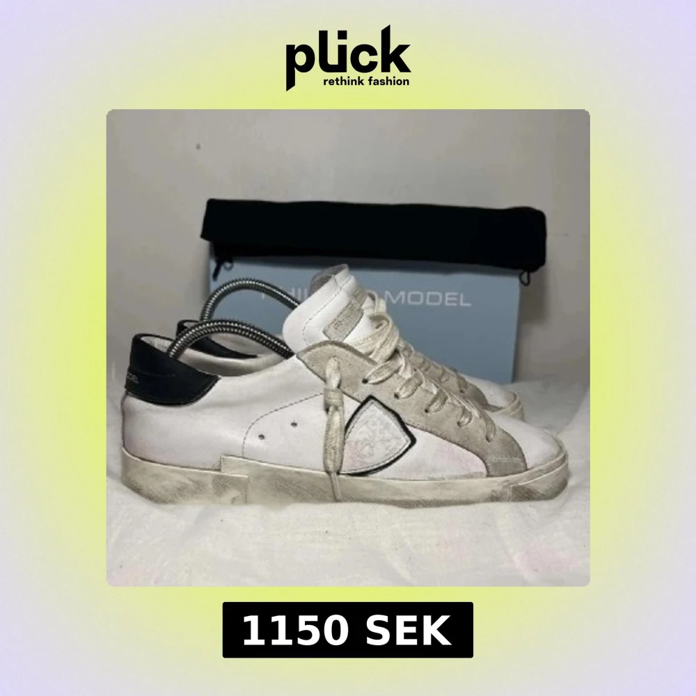 Säljer ett Philippe Model sneakers i vitt skinn med grå mockadetaljer och svart häl. Klassisk låg modell med rund tå, snörning och platt sula. Skorna har en cool sköldlogga på sidan och en stilren vibe som gör din outfit snyggare! Skostorleken är 40 och kartong medföljer! Kan skicka via post. Skriv om ni är intresserade!