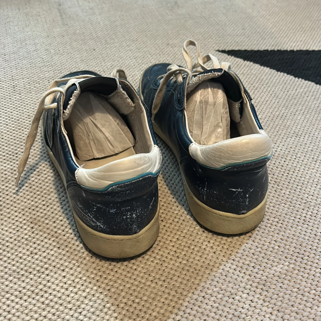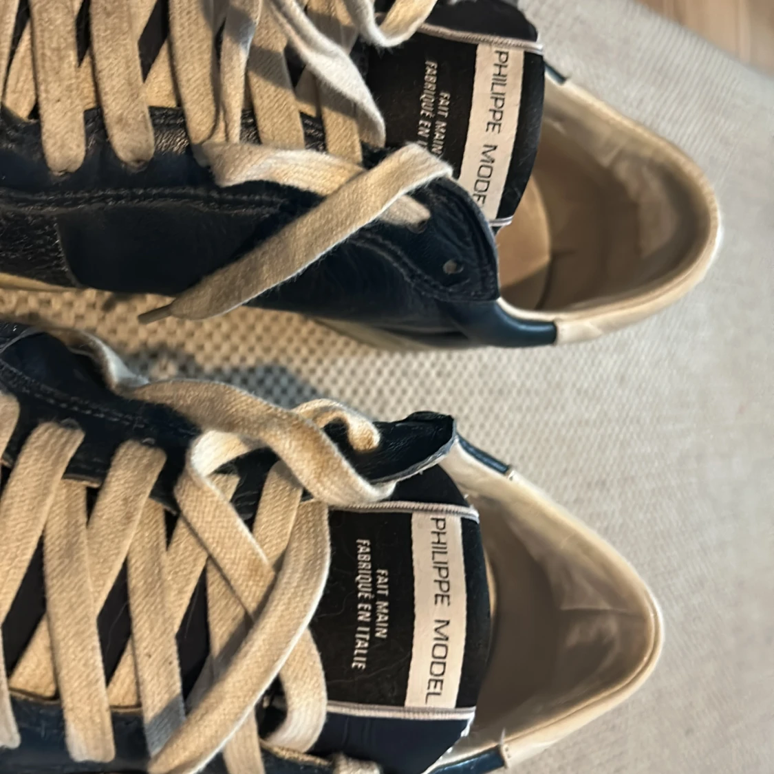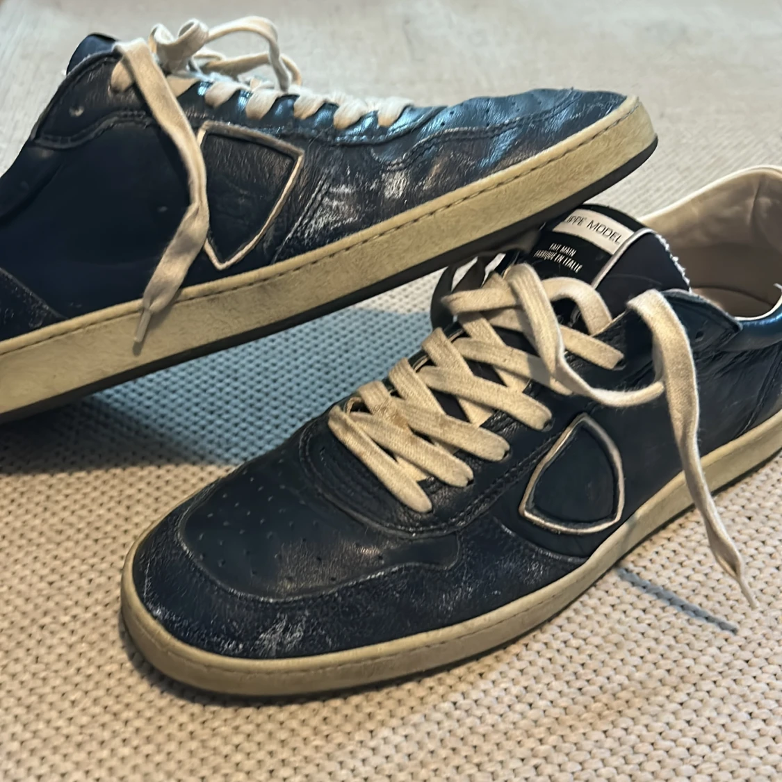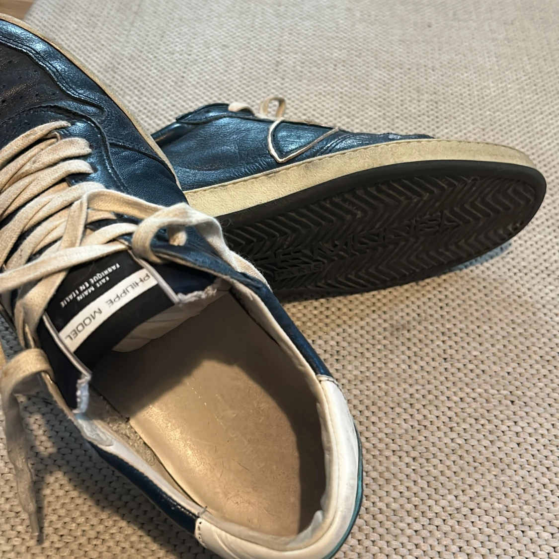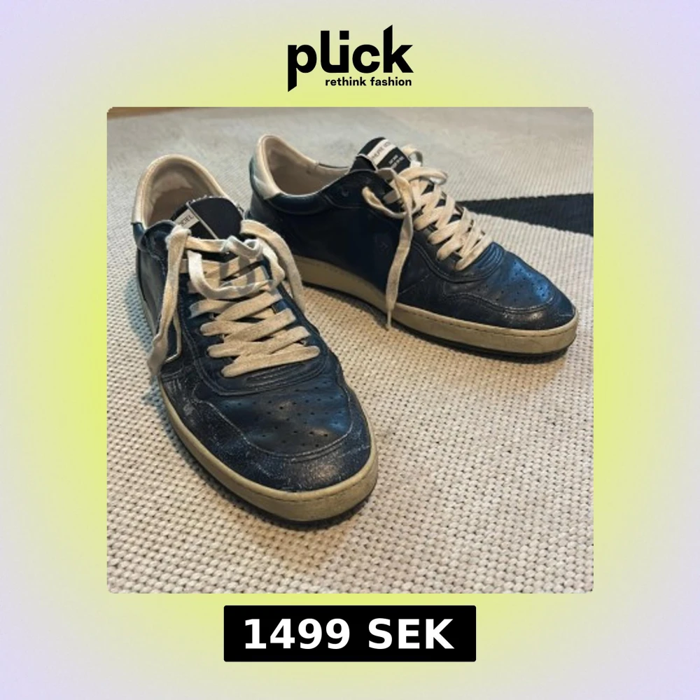 Snygga blåa sneakers från Philippe Model med vita detaljer och vit snörning. Klassisk låg modell med rund tå och platt sula. Handgjorda i Italien och har en cool vintage vibe med kontrasterande vit häl och sula. Storlek 41!