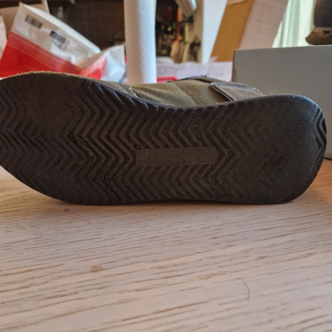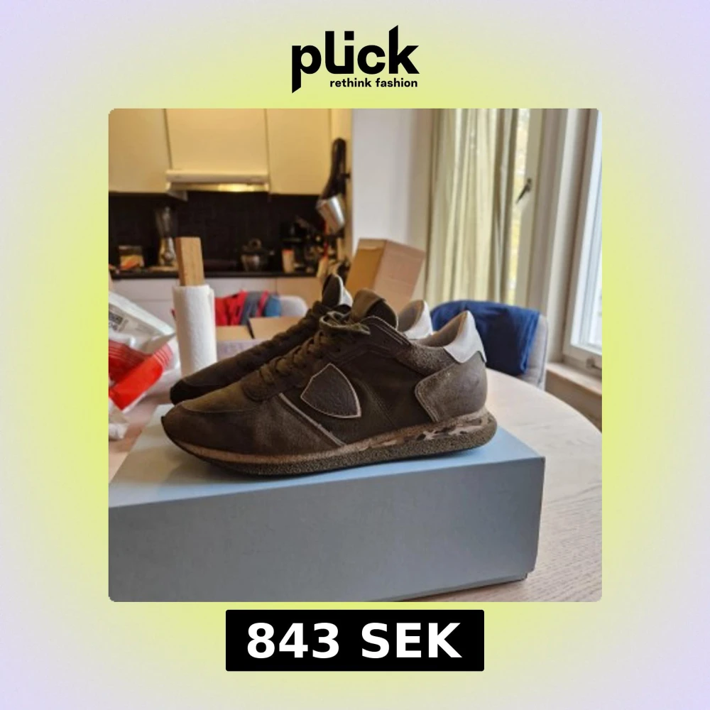 Snygga sneakers från Philippe Model i mörkgrönt med beige detaljer. Skorna har en rund tå, snörning och en platt sula med camo-mönstrad kant. Ovandelen är tillverkad i mocka och textil, med logotyp på sidan och bakre hälparti i ljus mocka.