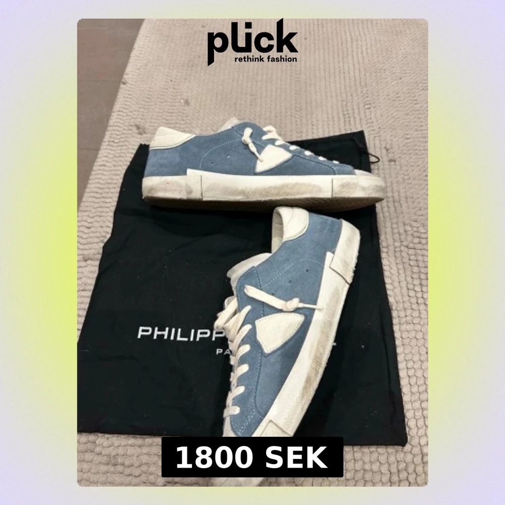 Säljer ett par Philippe Model sneakers i blått och vitt. Skorna har en snygg låg profil, rund tå och platt sula. Ovandelen är i mocka och skinn med vita snören och detaljer. Kommer med originalpåse och låda. Perfekt för dig som gillar stilrena sneakers.