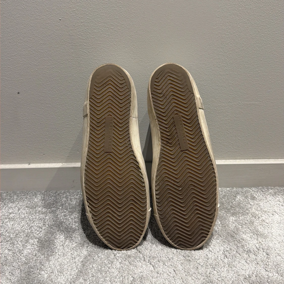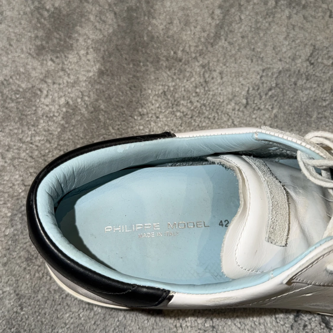 Snygga vita sneakers från Philippe Model med svart häl och ljusblå insida. Skorna har rund tå, snörning och platt sula. Tillverkade i Italien i mjukt skinn med diskret logodetalj på sidan. Perfekta för dig som gillar stilrena och klassiska sneakers. Mitt pris 1200 nypris 3800