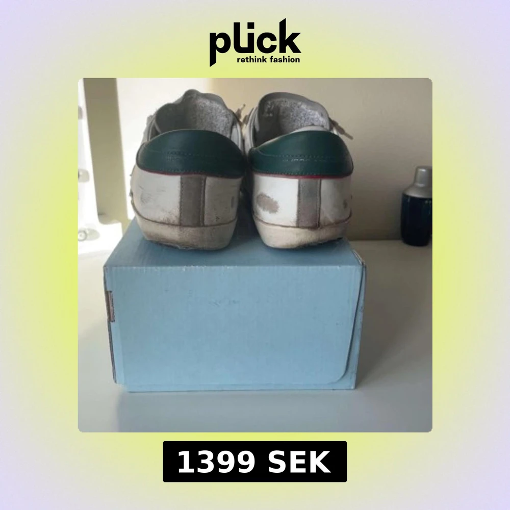 Säljer ett par vita sneakers från Philippe Model med gröna detaljer på hälen och gråa partier vid tårna. Skorna har snörning och en rund tå. Perfekta för en avslappnad stil. Väldigt sköna just inför sommaren för dig som vill ha en skön sheek lite stekig outfit, finns de finn hål på hälen men märks knappt när man går 🤩 väldigt snygga för priset och nypris ligger på 2800-3000kr