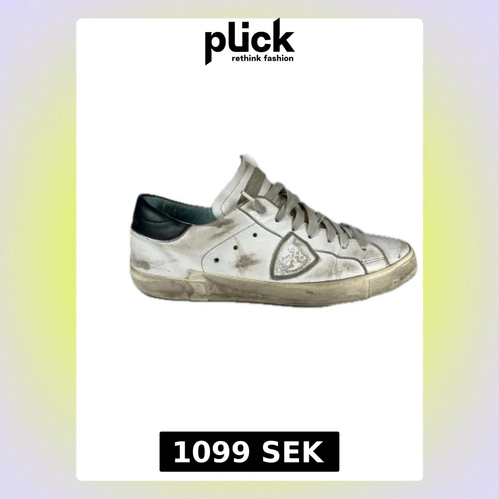 Säljer ett par vita Philippe Model sneakers med grå snörning och svart häl. Skorna har en rund tå, platt sula och är tillverkade i skinn. Snyggt sliten look med logotyp på sidan och diskreta grå inslag på ovandelen. Storleken passar även för 43