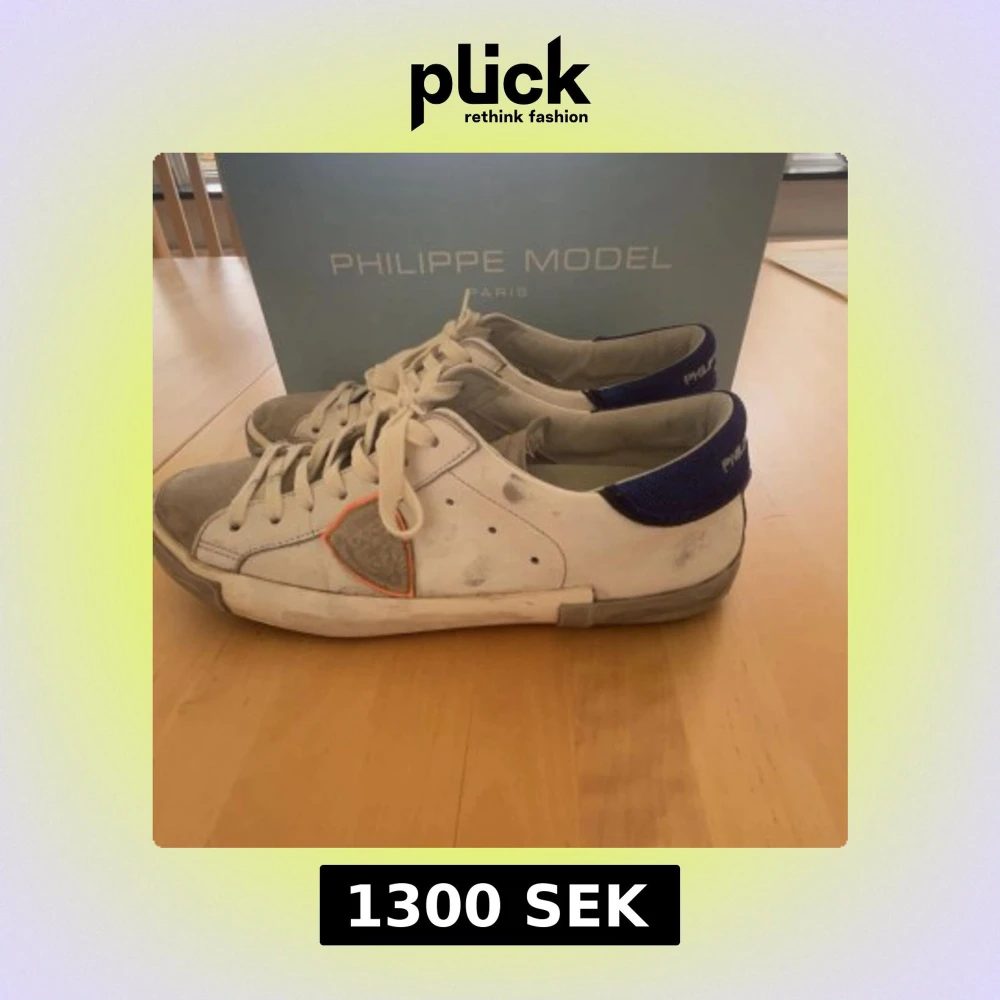 Snygga vita sneakers från Philippe Model med grå mockadetaljer på tån och sidan, samt blå mesh vid hälen. Skorna har snörning och en orange kant runt loggan på sidan. Perfekta för dig som gillar en stilren men ändå unik look. Storlek 43 och priset går att diskutera