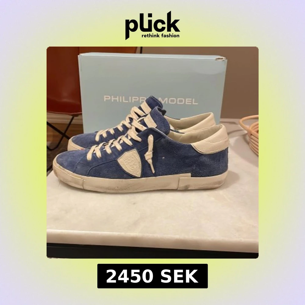 ( Ny pris 3600kr) Snygga blå sneakers från Philippe Model i mocka med vita skinn-detaljer och vit sula. Skorna har klassisk snörning och en sköldlogga på sidan. Perfekta för dig som gillar stilrena och trendiga sneakers med premiumkänsla. Om de är något ni undrar tveka inte av att höra av er. ( Använd 1-2 gånger)