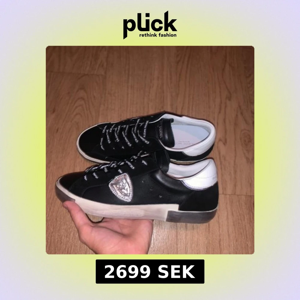 Snygga svarta Philippe Model sneakers med vita detaljer och logga på sidan. Skorna har vita snören med tryckt logotyp och vit häl. Tillverkade i skinn med klassisk platt sula och rund tå. Perfekta för dig som gillar stilrena och trendiga sneakers.